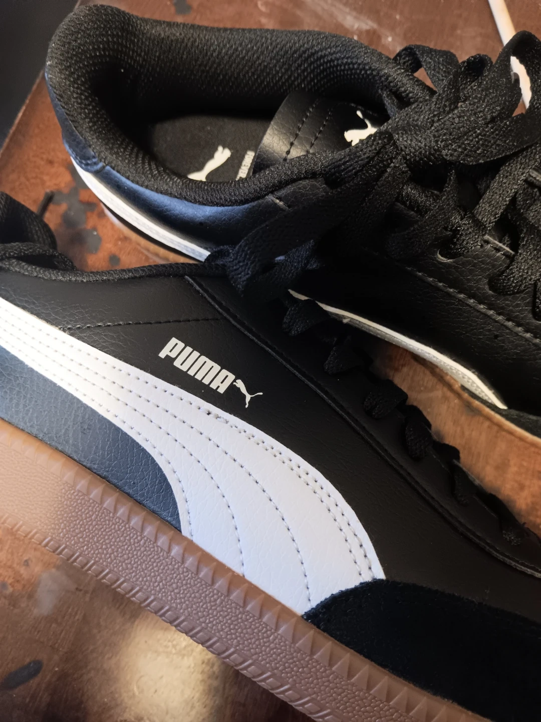 Puma black running shoes with white accents. Size is 9 1/2. These shoes are great for hitting the track or just for casual wear.