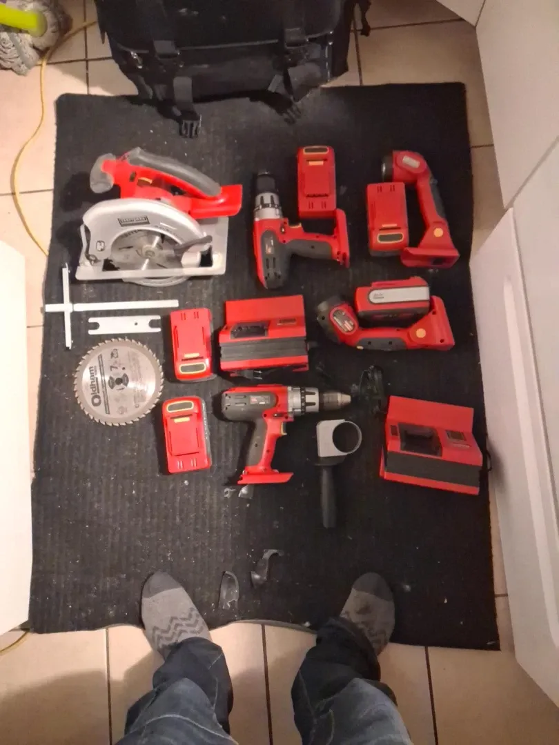This is a Craftsman cordless power tool set. It includes a circular saw, drill, flashlight and other accessories, along with multiple batteries and 2 chargers and finally a convenient craftsman brand tool bag to tote it all in. tools are red and black. Featuring 20 volt lithium ion battery's.