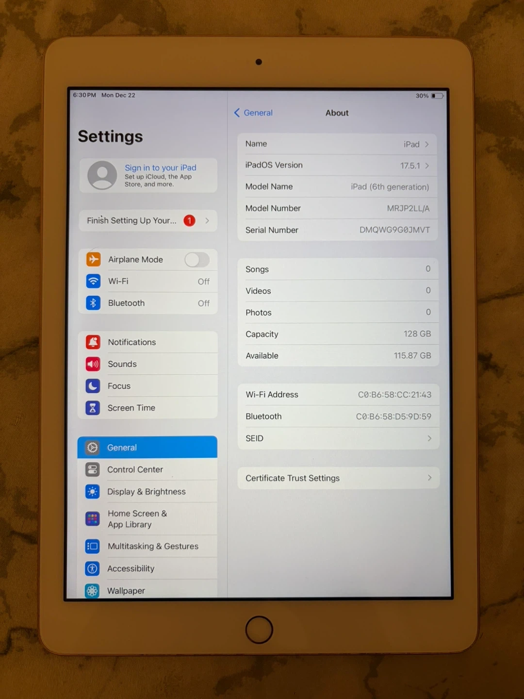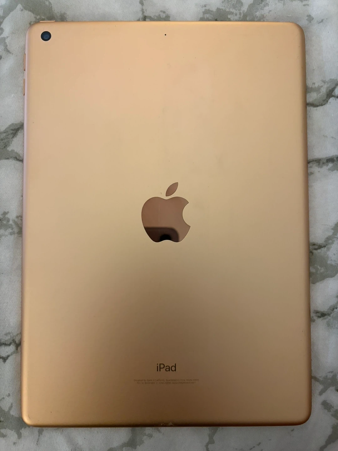 This is a gold Apple iPad (6th generation) with 128GB of storage. It runs iPadOS 17.5.1. This device is great for browsing, streaming, and casual gaming. It's in good condition and ready for a new owner!