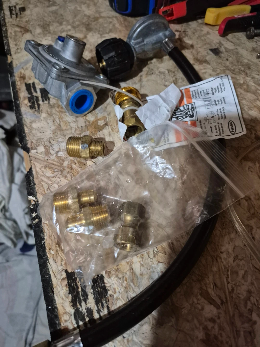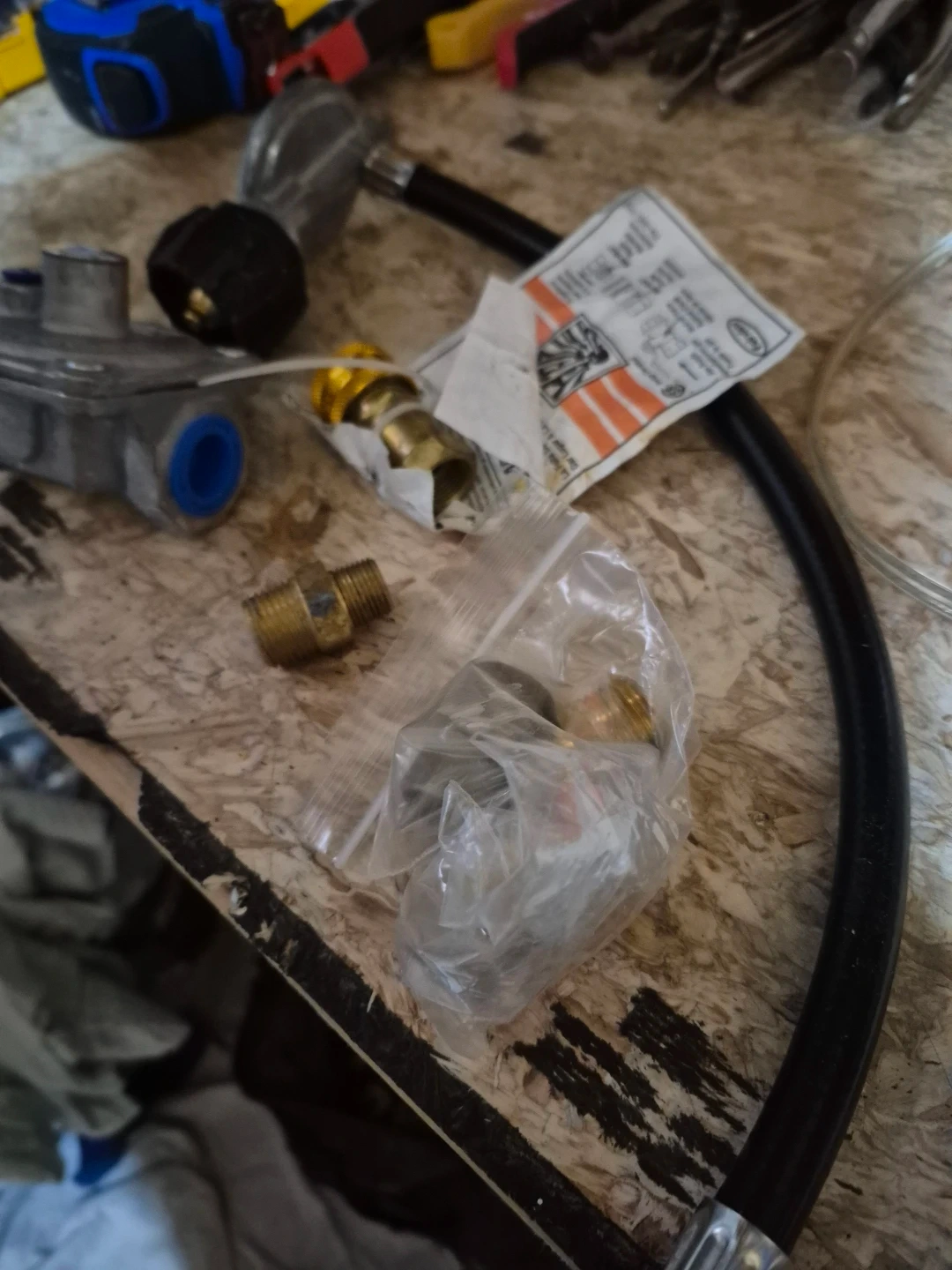 This is a propane regulator set that includes a propane hose and various brass adapters. It's designed for connecting propane tanks to appliances. All components appear to be in good condition and ready for use.