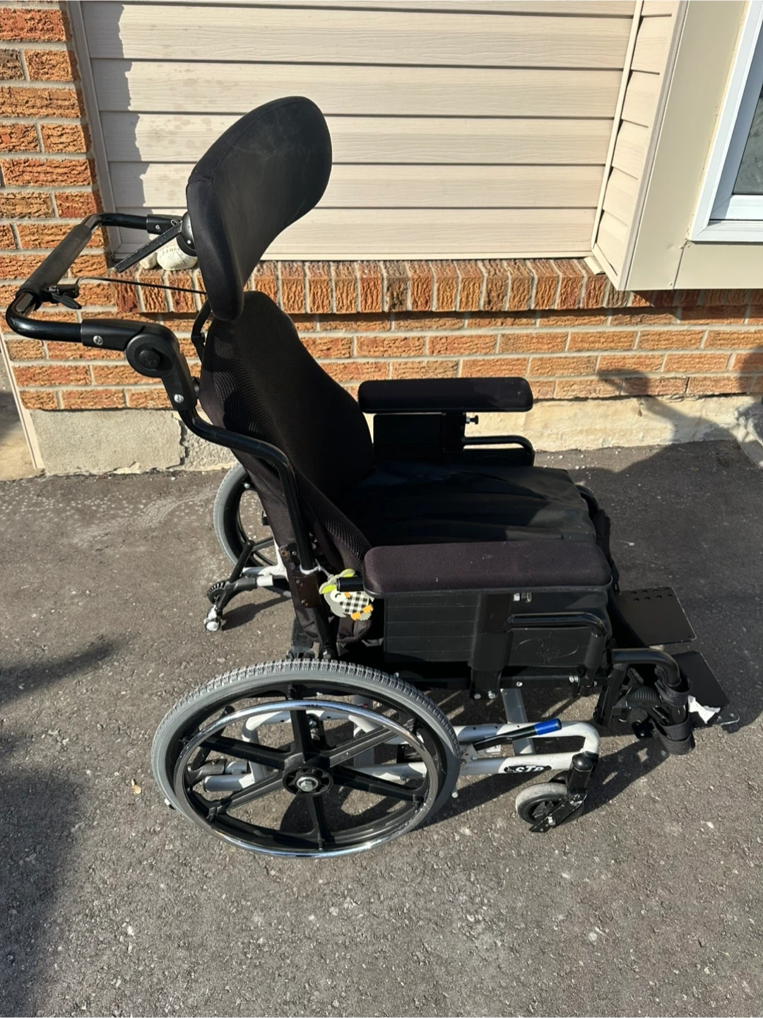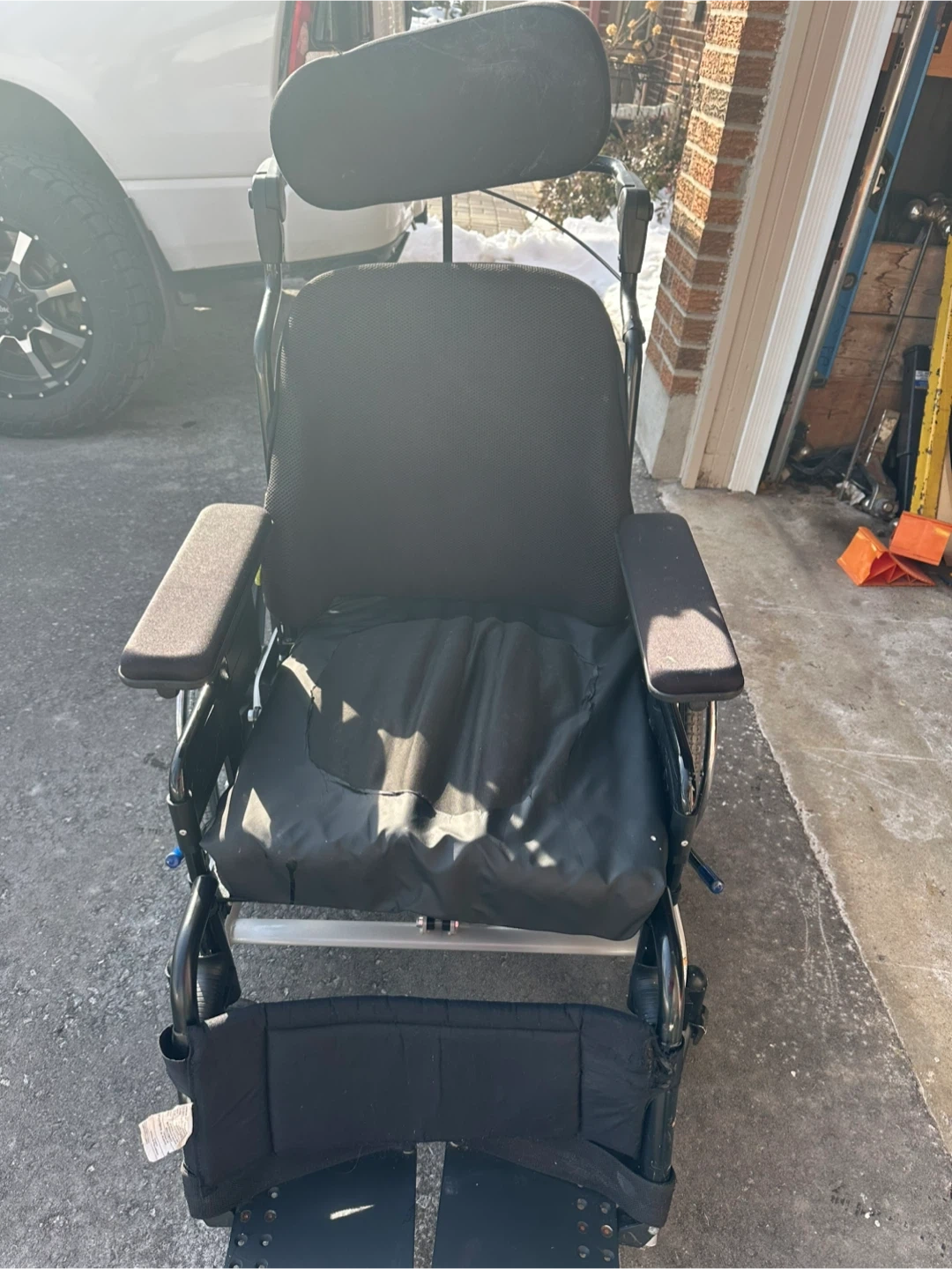 This Sunrise Medical "Supertilt" wheelchair is designed for comfort and support. It's a 20x18 size. The wheelchair includes a headrest and adjustable armrests for customized positioning. It's a versatile mobility aid for various needs. Air cushion seat with pump for comfort.