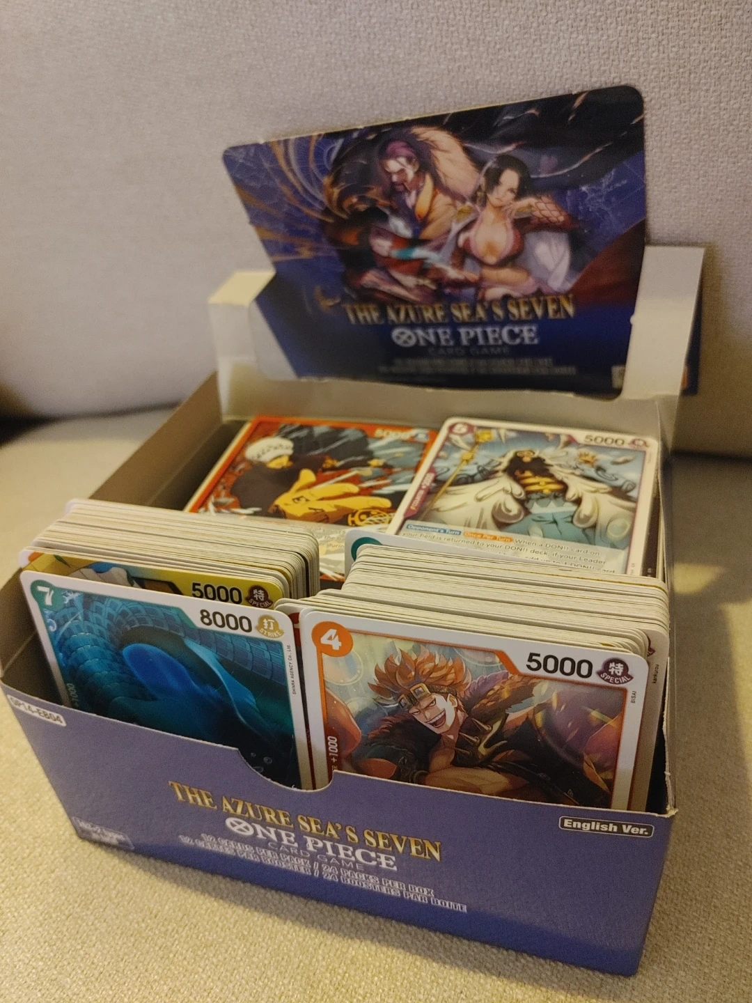 This is a filled box for the One Piece Card Game, featuring 'The Azure Sea's Seven' set (English version). Includes good and commons, all in Excellent condition.