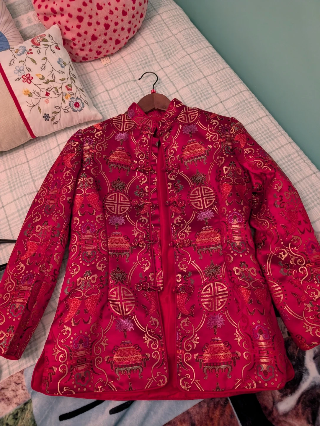 Red Brocade Jacket with Traditional Chinese Motifs