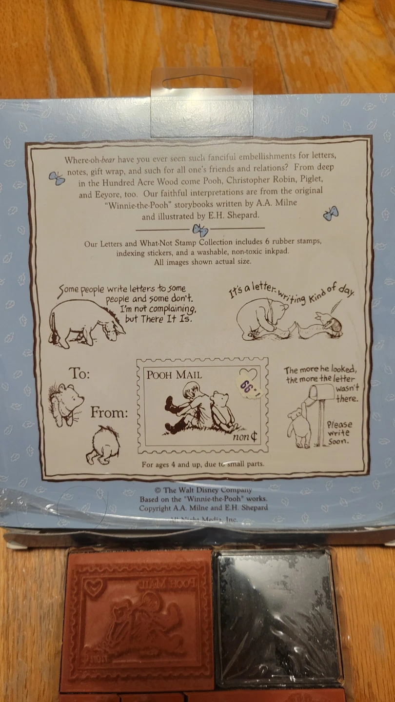 This is a Letters & What-Not Stamp Collection featuring 6 rubber stamps. It includes a washable, non-toxic inkpad. Stamps are inspired by A.A. Milne's "Winnie-the-Pooh" stories and E.H. Shepard's illustrations. Perfect for crafting or creative mail projects!