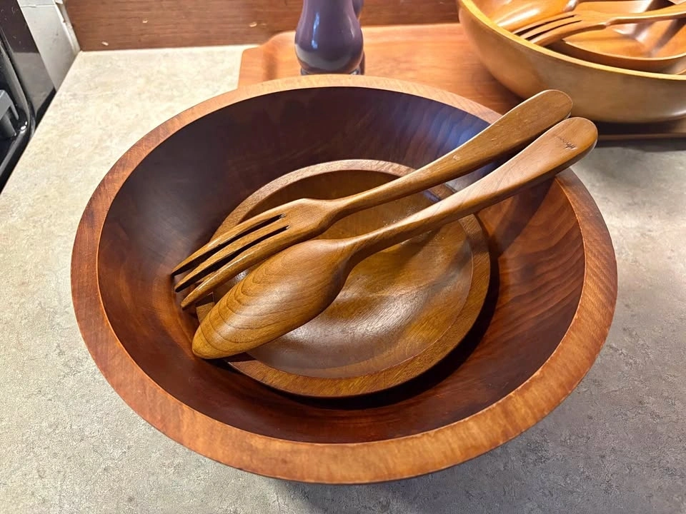 Used mainly as kitchen decor. The big bowl has minor signs of wear but still displays nicely. Smaller bowl and wooden utensils are included in the set. Beautiful 60βs-70βs retro vibes for your space. Pickup only in Burlington. Price is firm. Thank you.