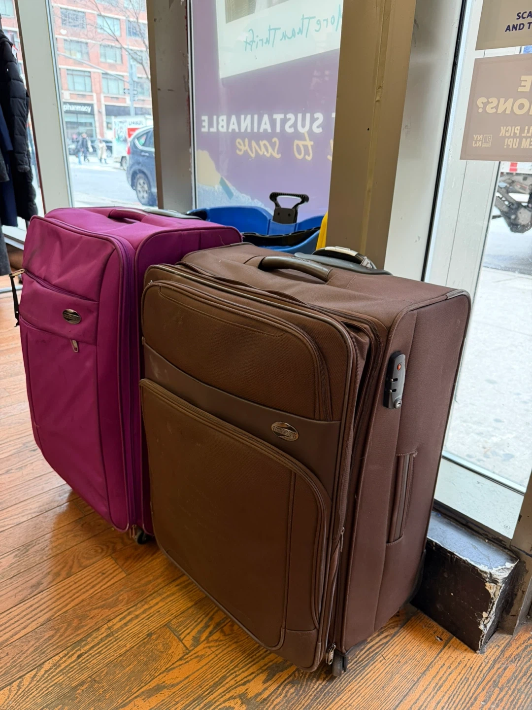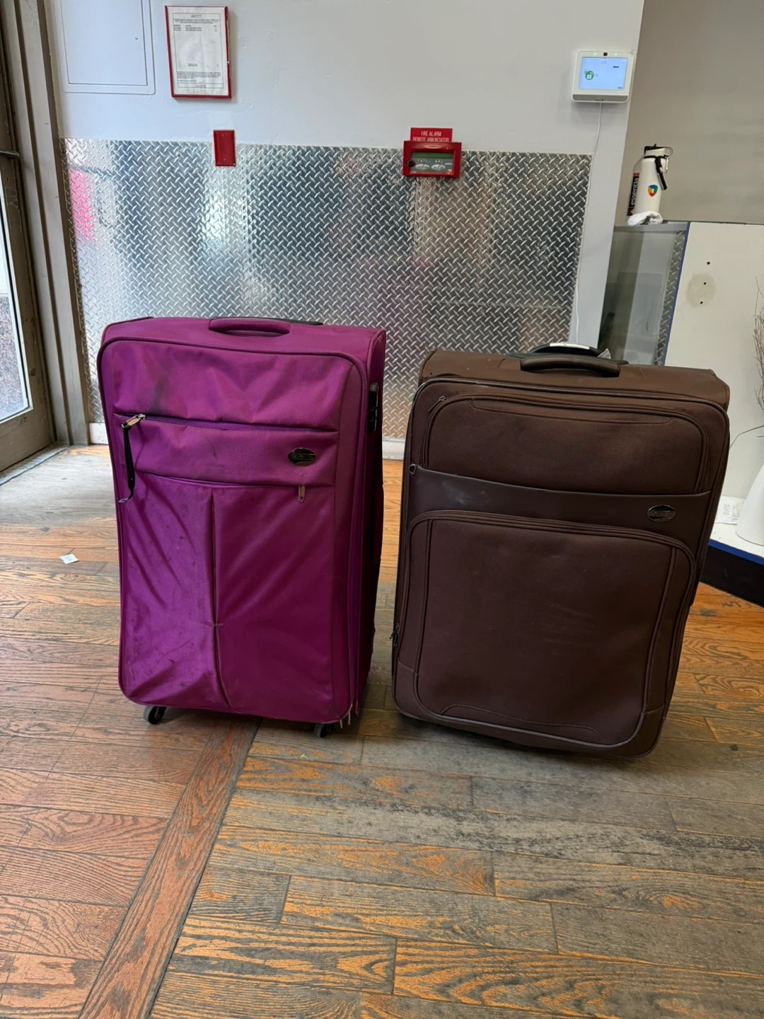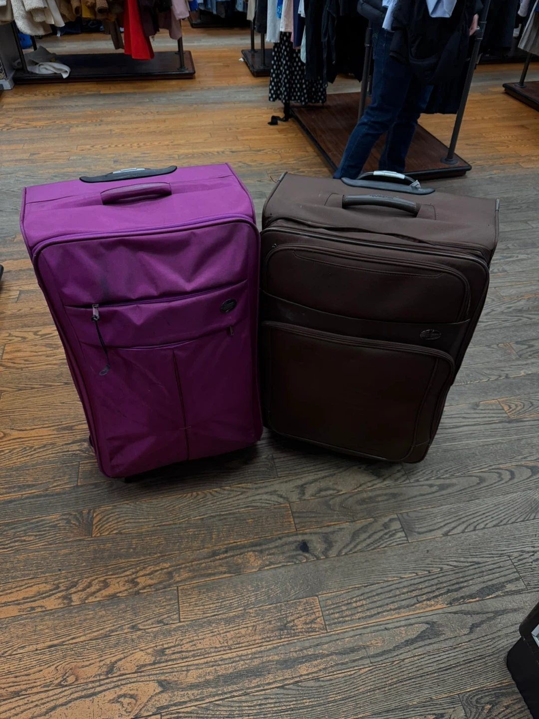 This set includes two rolling suitcases, one purple and one brown. Both have top handles and are made of fabric. They're great for travel! Dimensions: Purple suitcase is approximately 26 inches tall. Brown suitcase is approximately 24 inches tall.