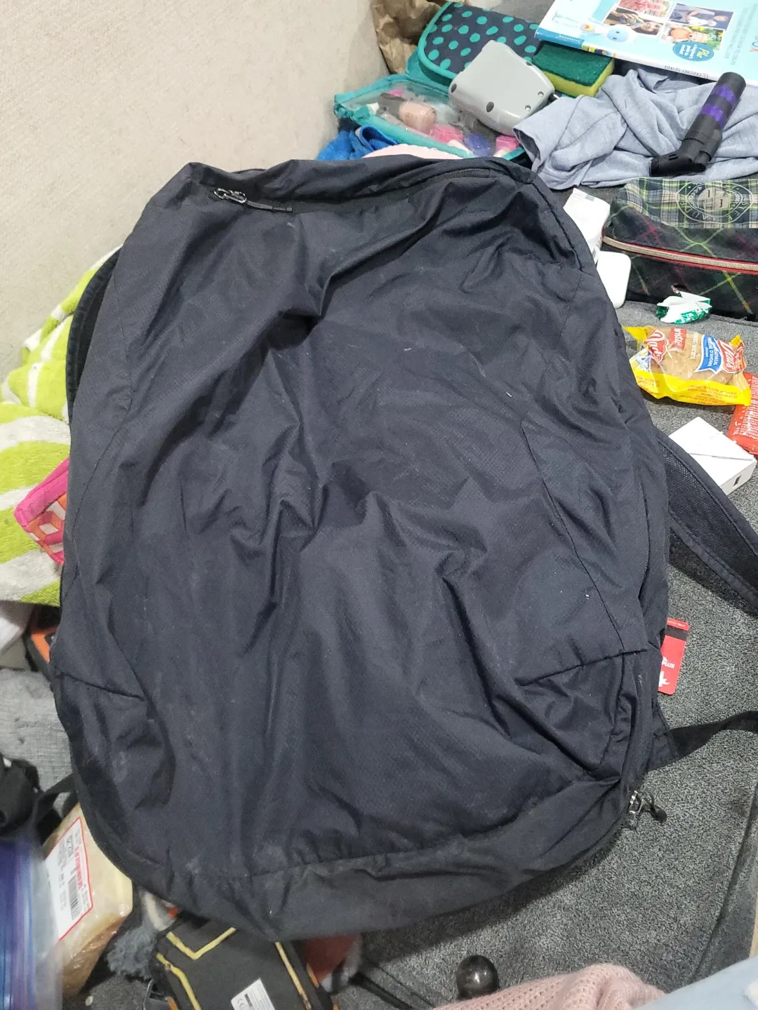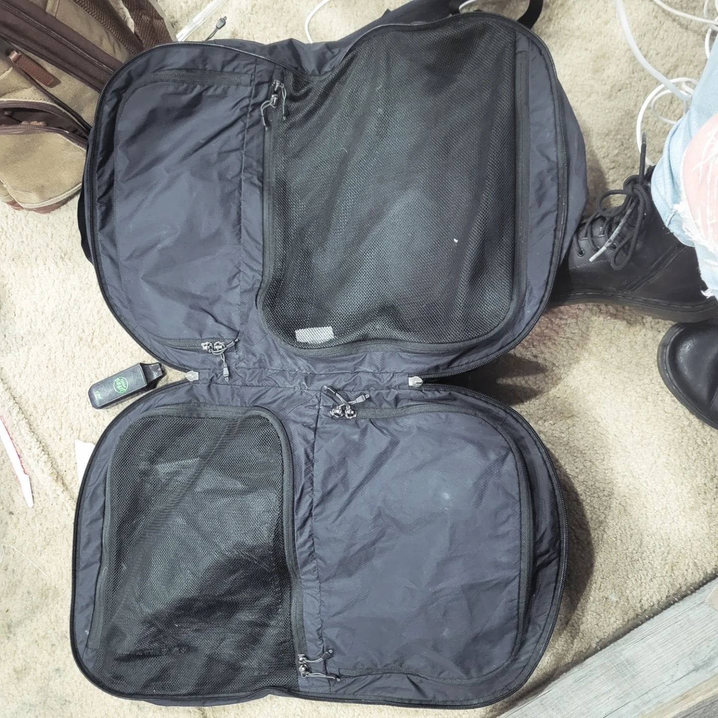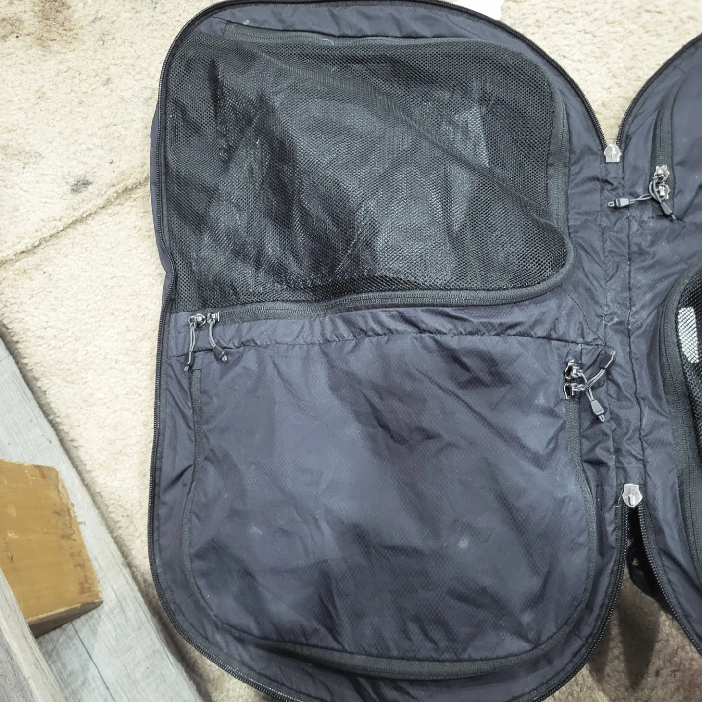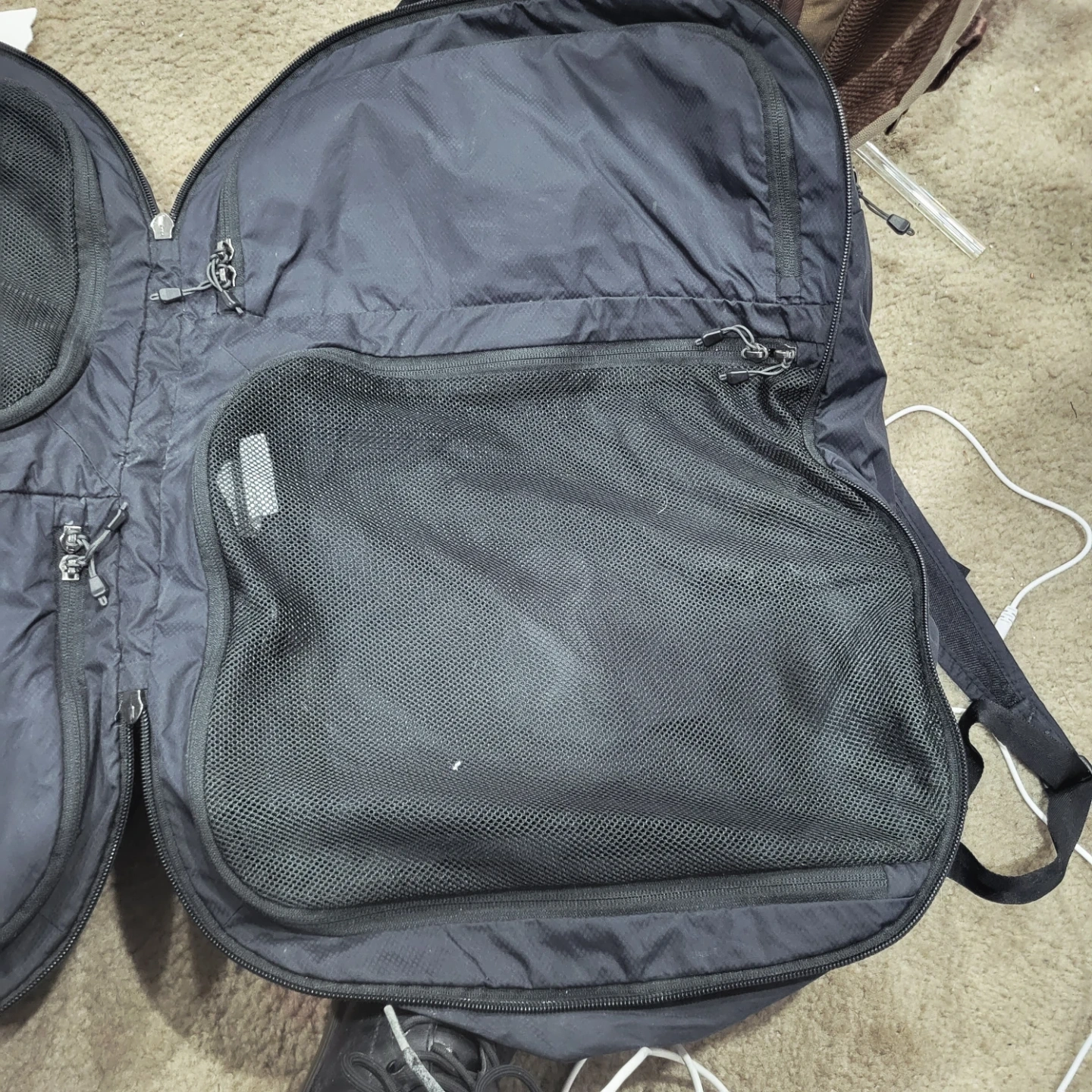 This is a black backpack with several zippered compartments, including mesh pockets inside. It's designed for organization and travel. Straps are adjustable.