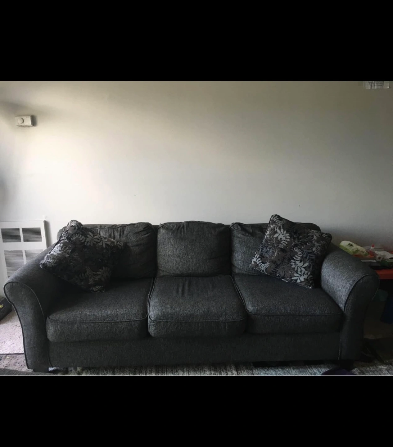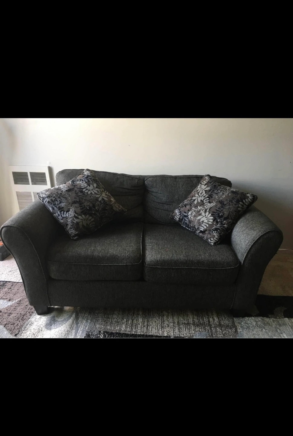 Matching sofa and loveseat. Dark grey fabric. Includes two throw pillows per piece. Excellent condition. Pet n smoke free home .Pick up only.