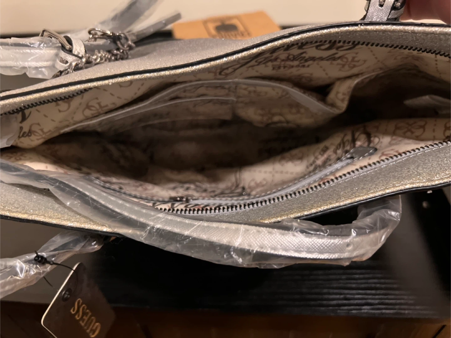 This is a brand new Guess silver glitter tote bag! It's a stylish and eye-catching accessory that's perfect for adding some sparkle to your outfit. Never been used and ready for a new home. Paid $100