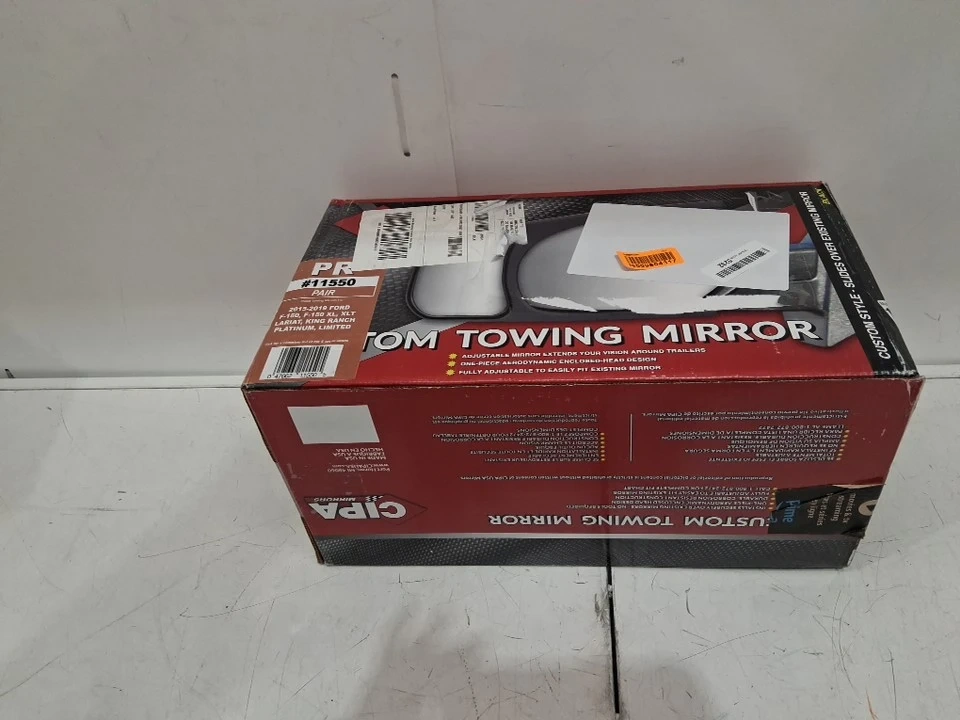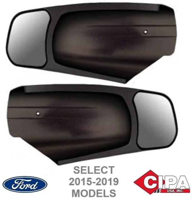 Enhance your towing capabilities with this Cipa 11550 custom towing mirror set for Ford F-150 trucks; practically brand new, these black mirrors easily slide over your existing mirrors with wedge lock security, ensuring a perfect fit without annoying vibration and easy installation, all without the need for tools.