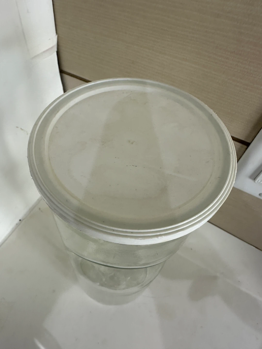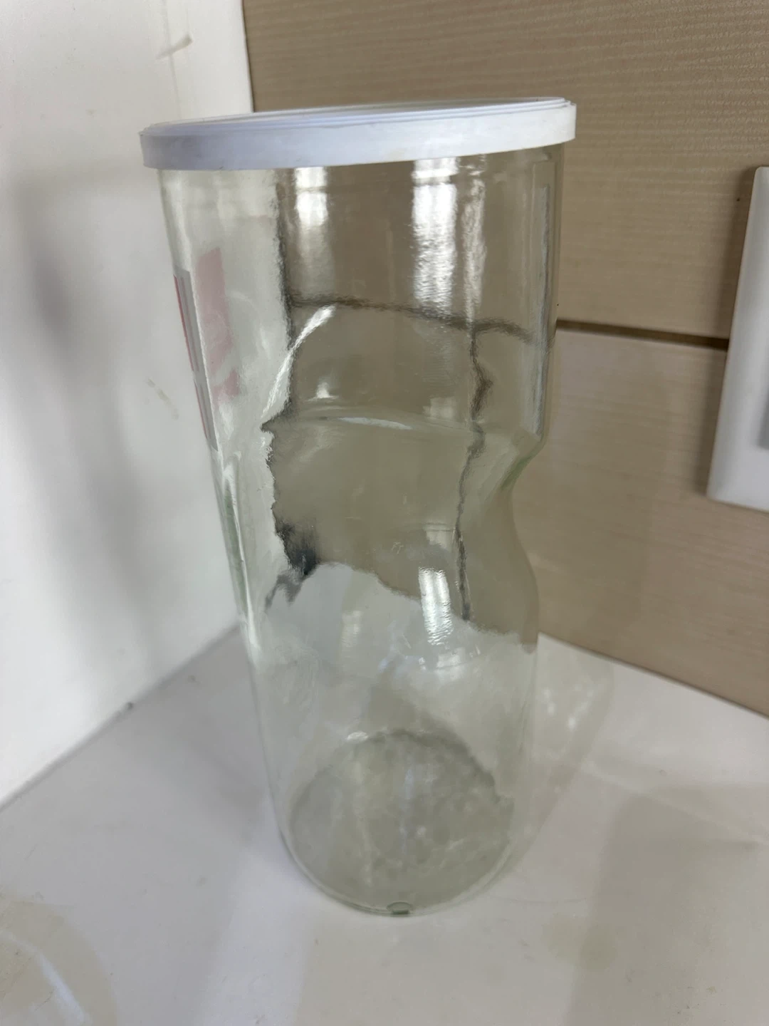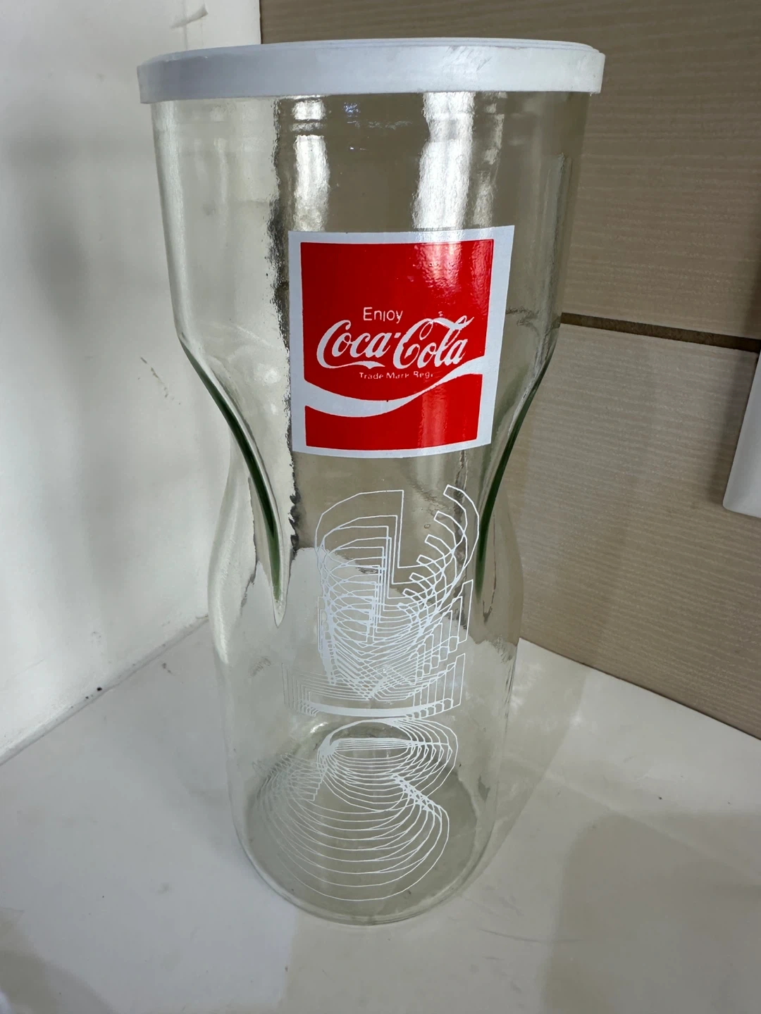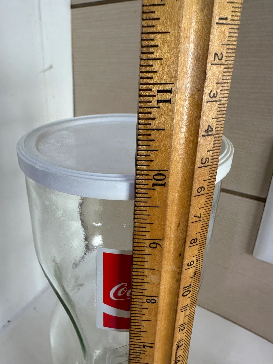 This is a clear glass jar featuring the classic Coca-Cola logo. It includes a white lid for storage. The jar's unique shape makes it stand out. It's about 10 inches tall, perfect for various uses!