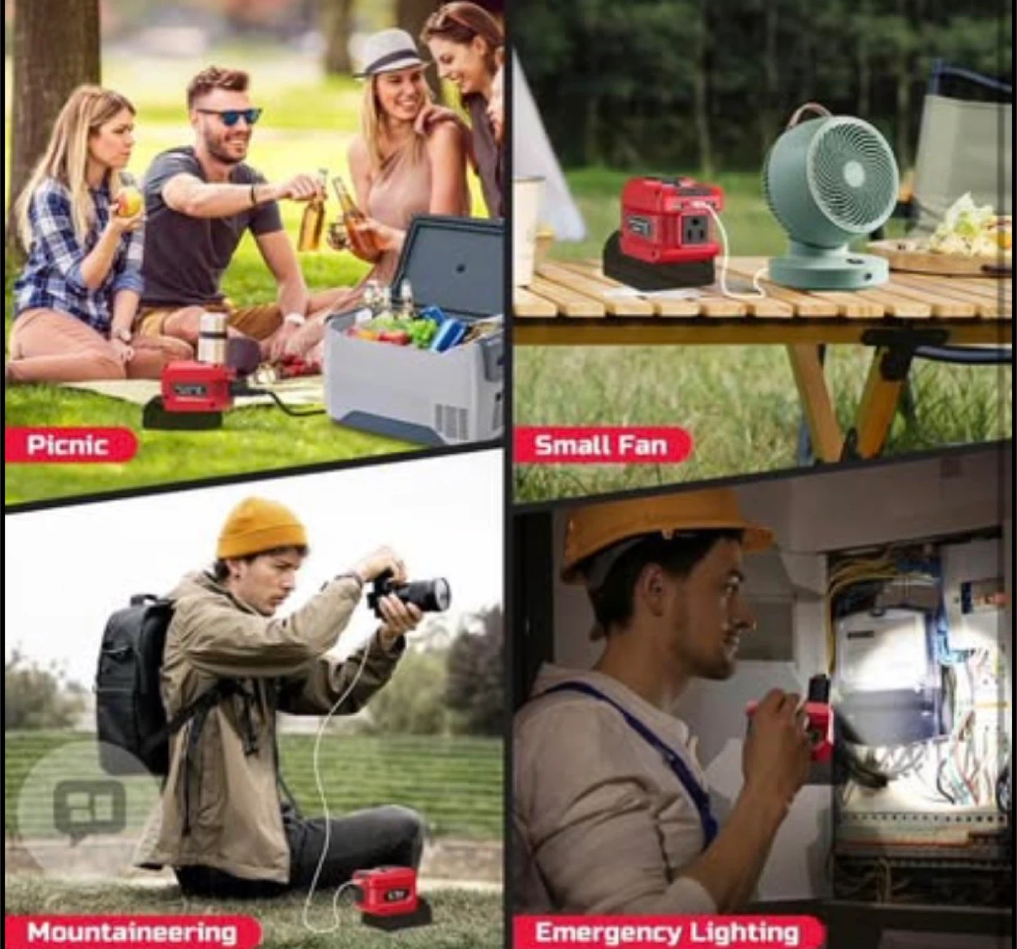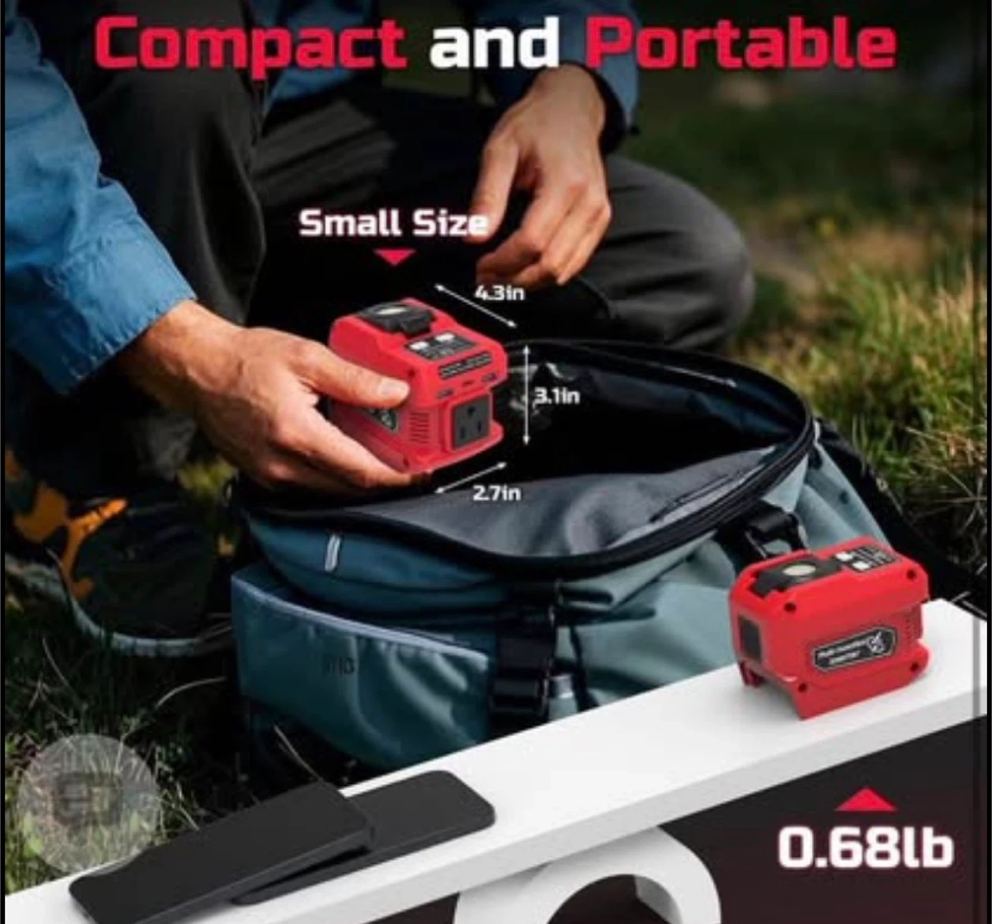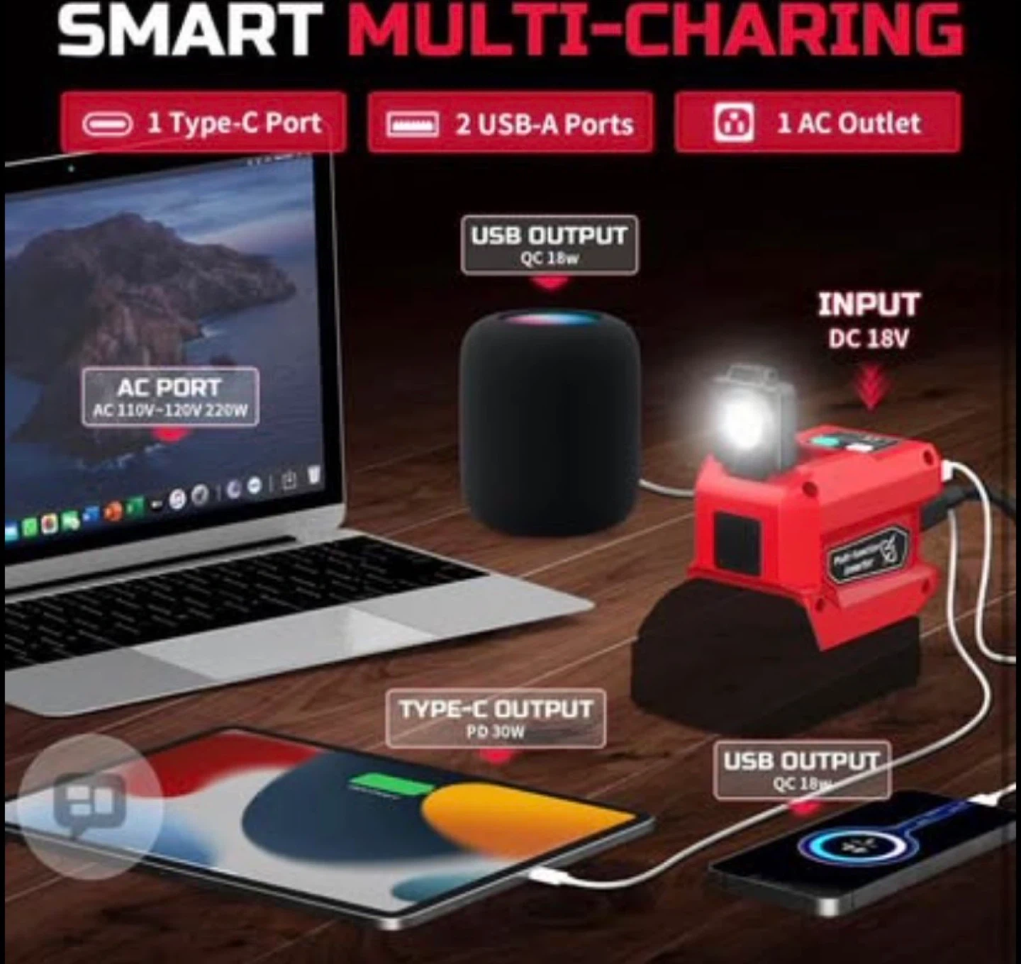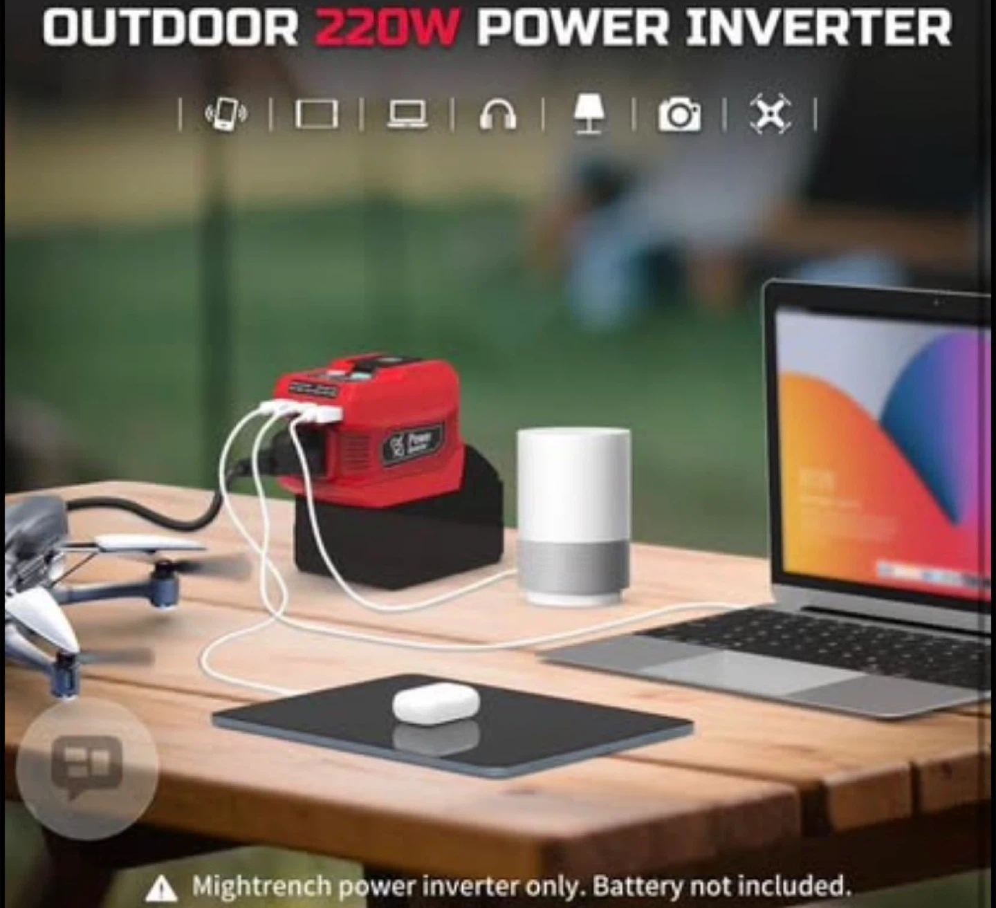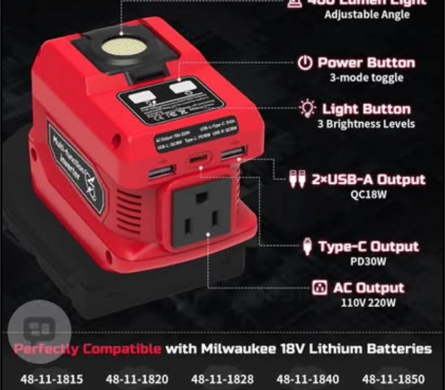 1 Pack 220W Power Inverter Compatible with Milwaukee 18V Battery, DC 18V to AC 110V-120V Portable Power Generator, Inverter with 2 USB Ports 1 Type-C 1 AC Outlet, 400 Lumen Light
