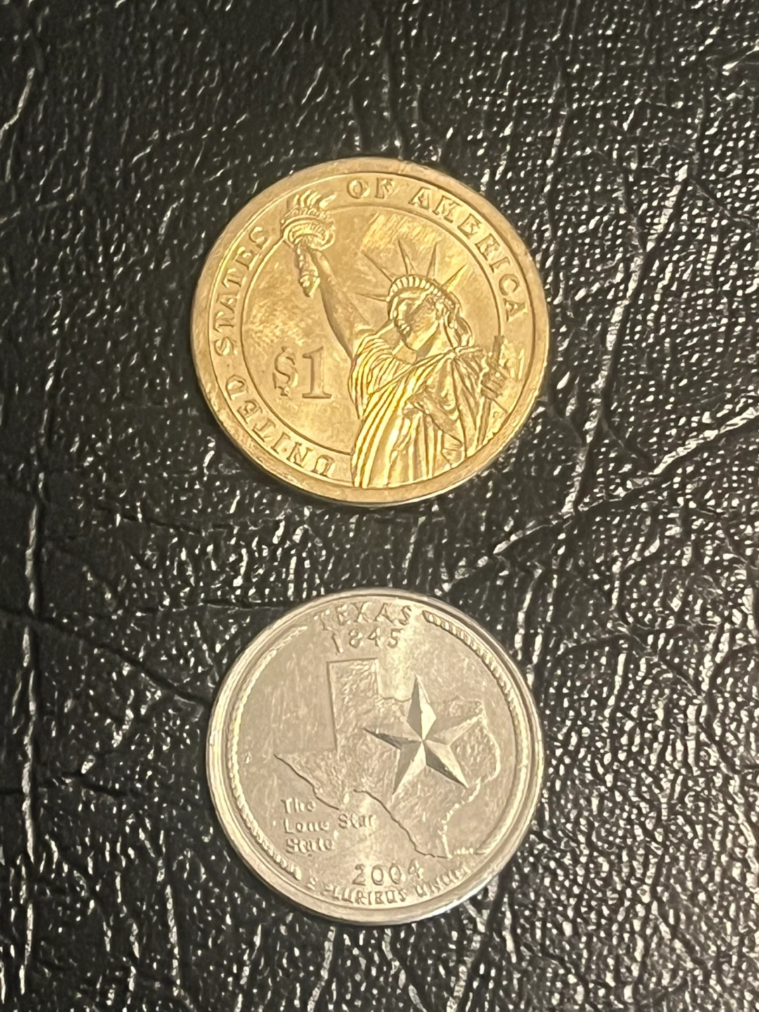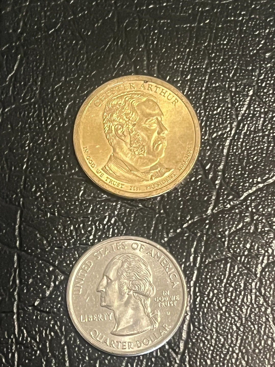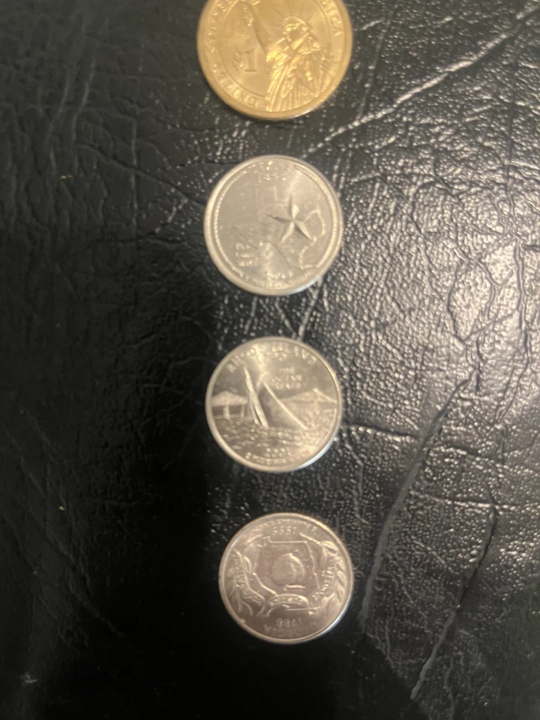 This lot includes one US dollar coin featuring Sacagawea and four state quarters: Texas (2004), Rhode Island (2001), and Georgia (1999). Also included is a commemorative coin featuring Chester Arthur, 21st President.