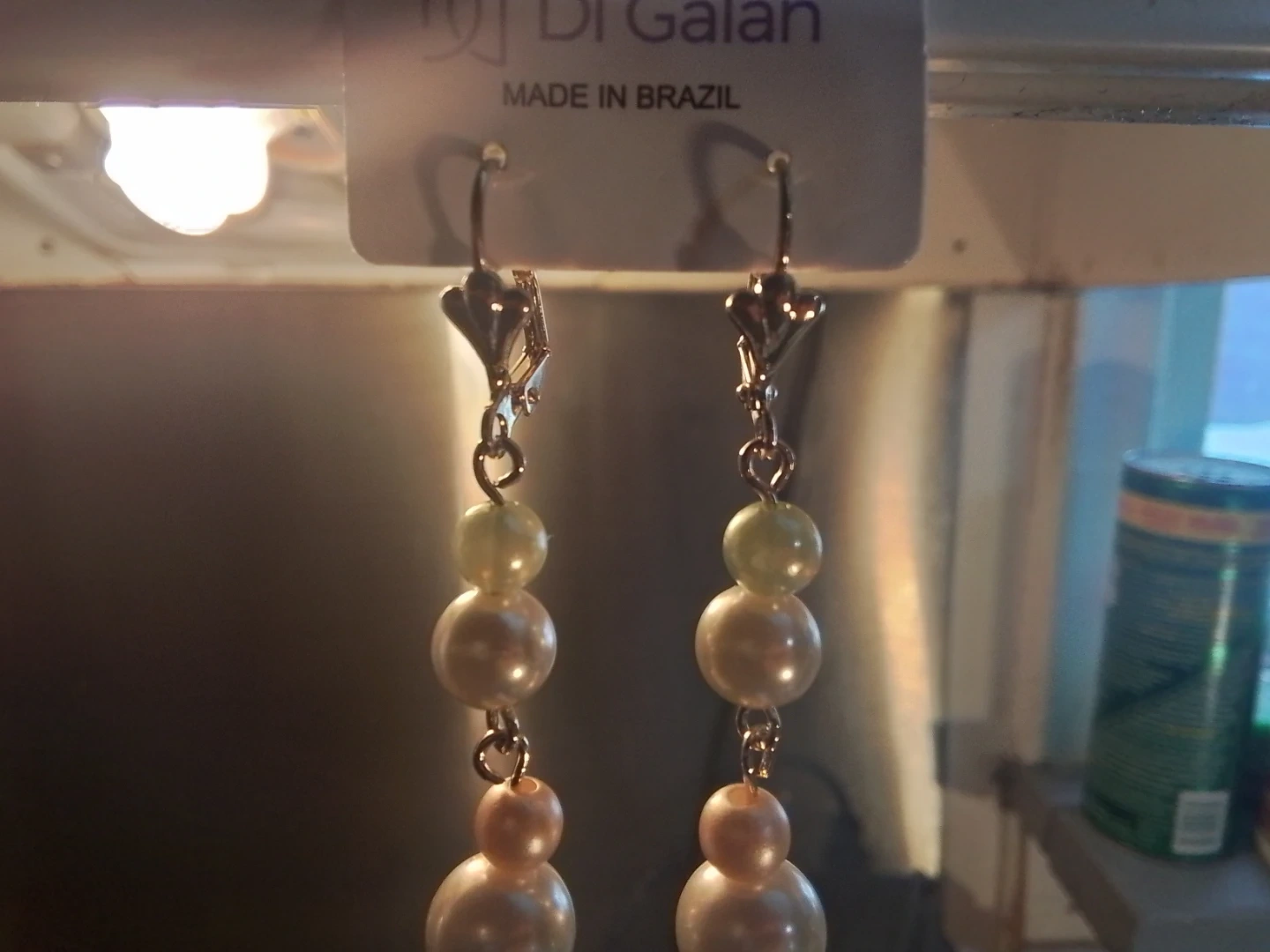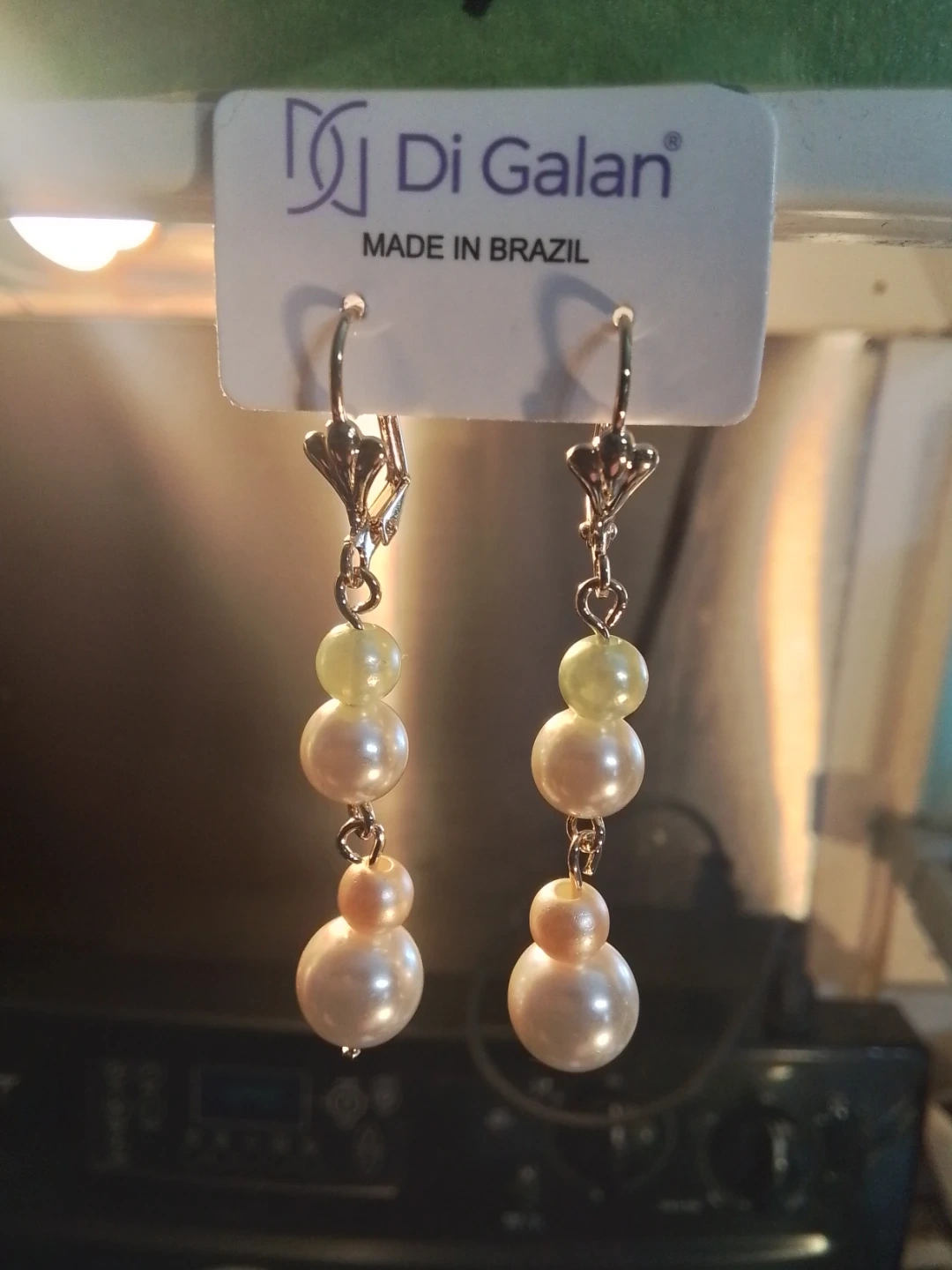 These are new Di Galan 18kt gold overlay drop earrings featuring lovely colour pearls, perfect for adding a touch of elegance to any outfit. The earrings are made in Brazil.