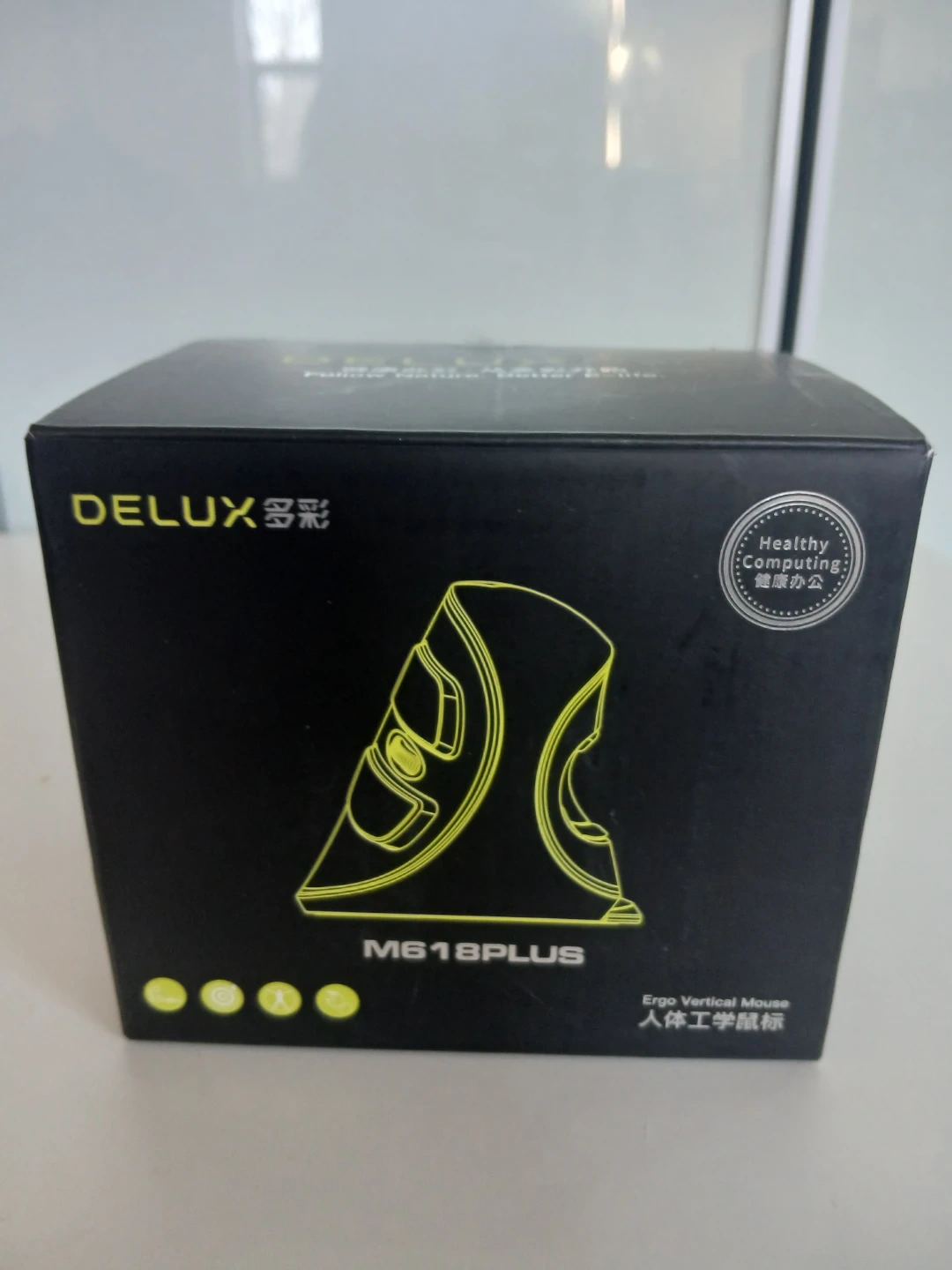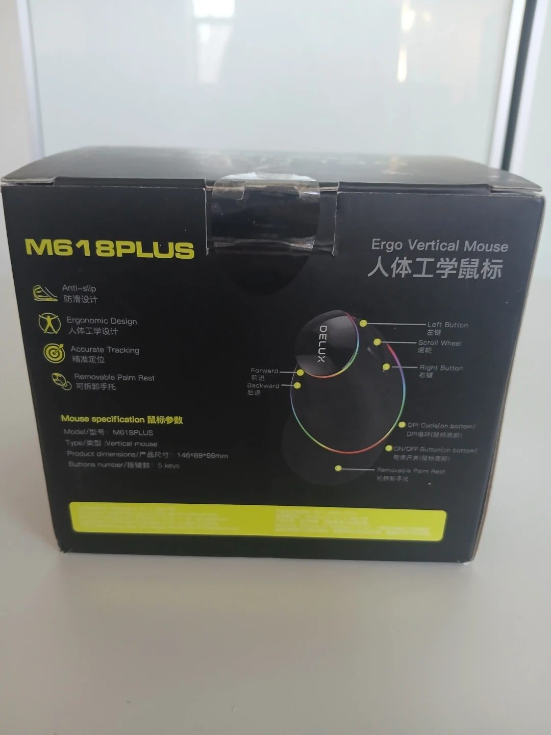 This is a DELUX M618PLUS ergonomic vertical mouse. It offers an anti-slip design and accurate tracking. It features a removable palm rest and 5 keys. Provides comfort and reduces RSI with a more natural hand position.