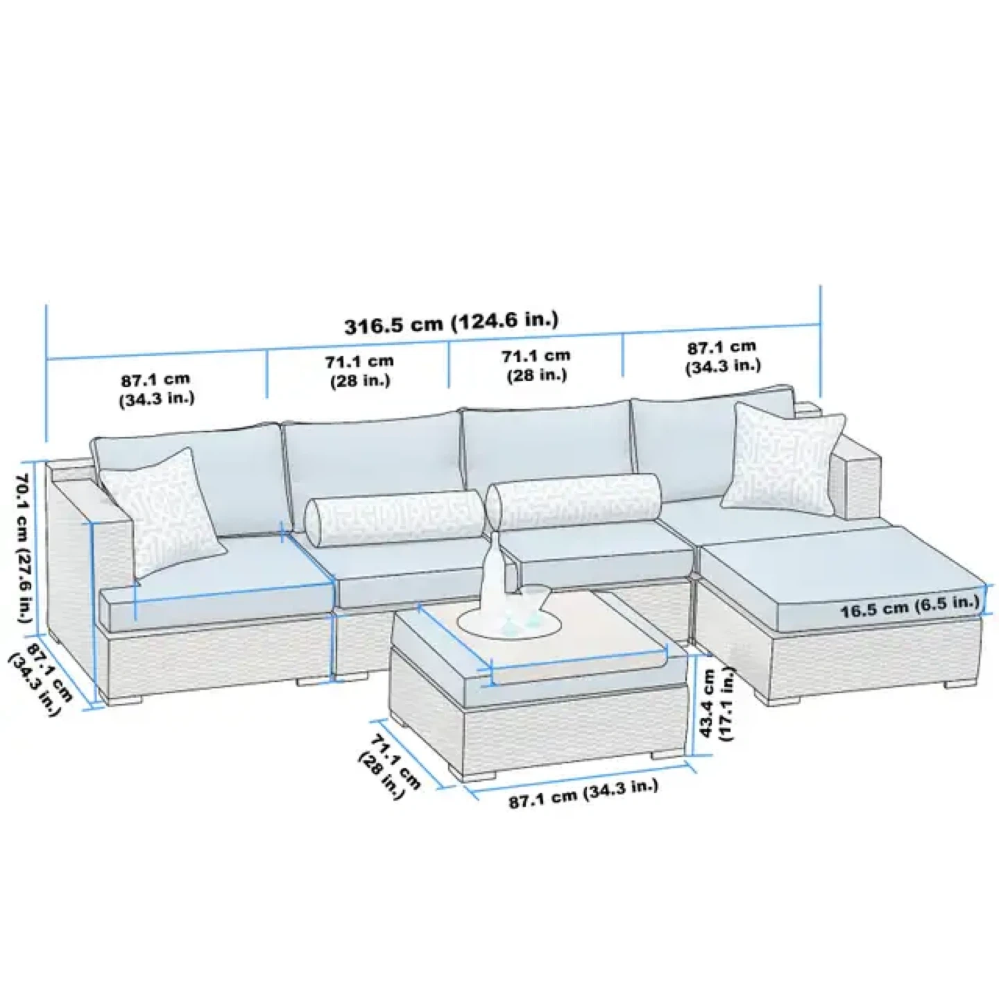 When assembled as a U: 316.5 cm x 158.2 cm (124.6 in. x 62.3 in.)