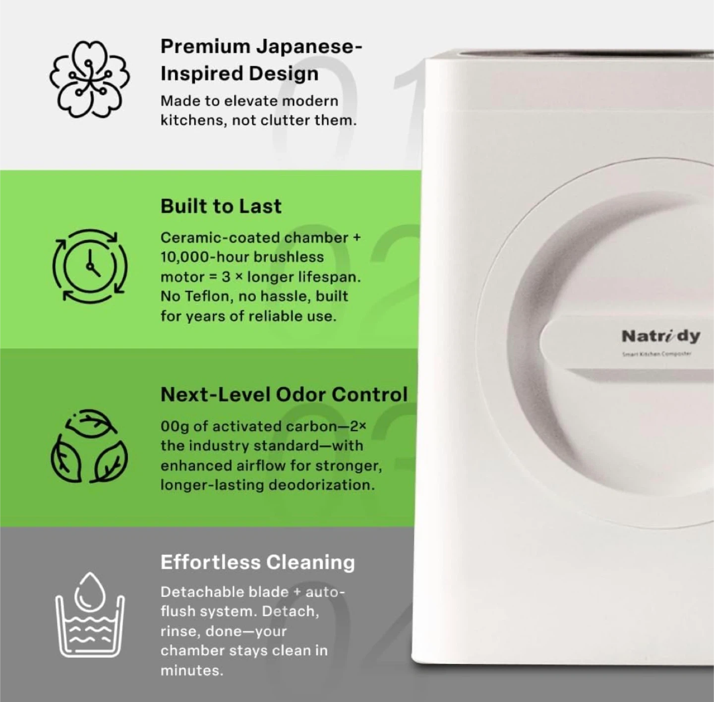 • Odor Control: 800g of activated carbon and optimized airflow trap odors even during heavy use.