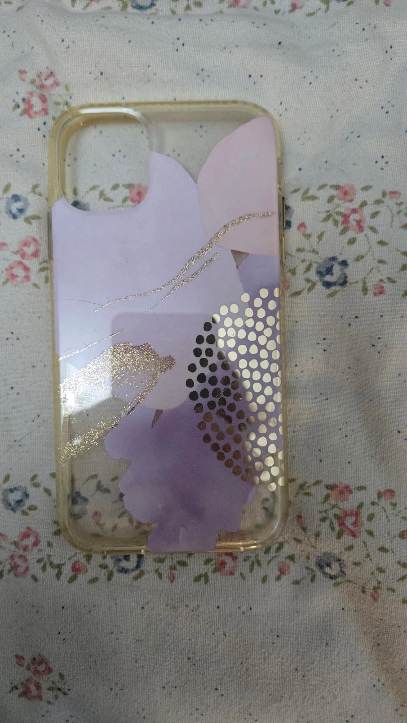 Clear phone case with a pretty purple and pink floral design. It has gold glitter accents and a gold dot pattern. Offers good protection for your phone.