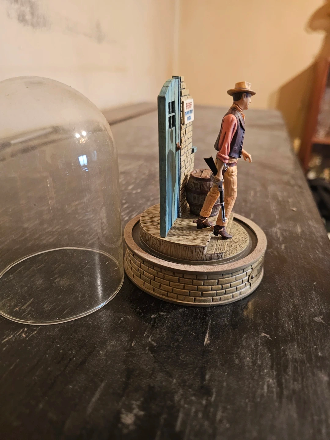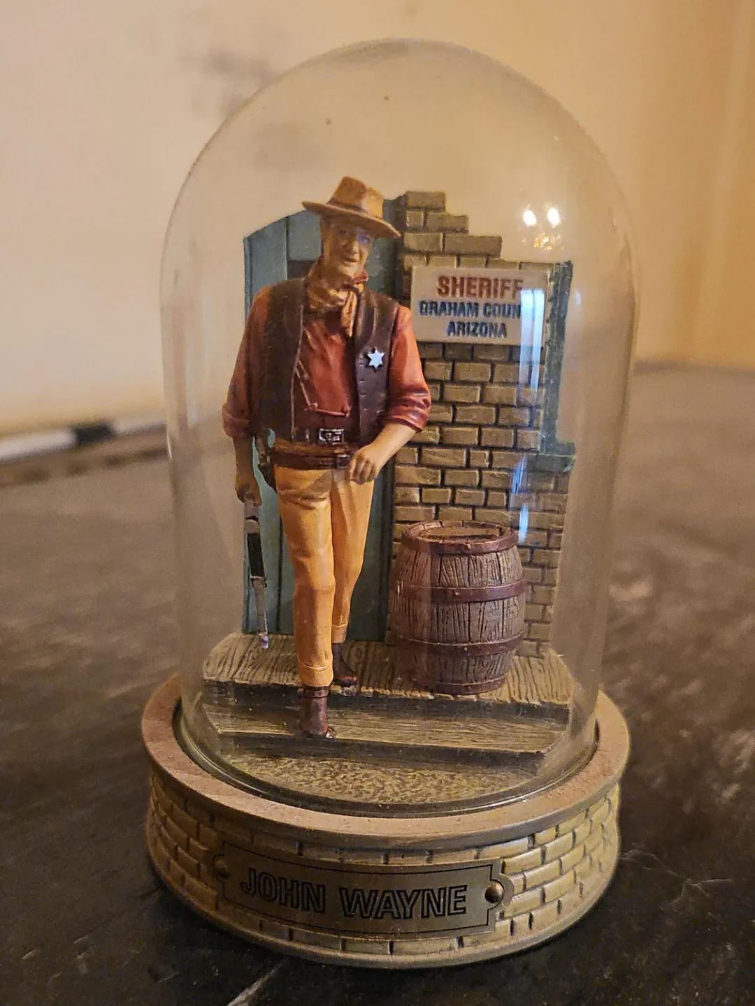 This is a collectible figurine featuring John Wayne as the Sheriff of Graham County, Arizona. The detailed piece includes a sheriff's badge, sheriff's office facade, and a barrel. It's housed under a clear glass dome.