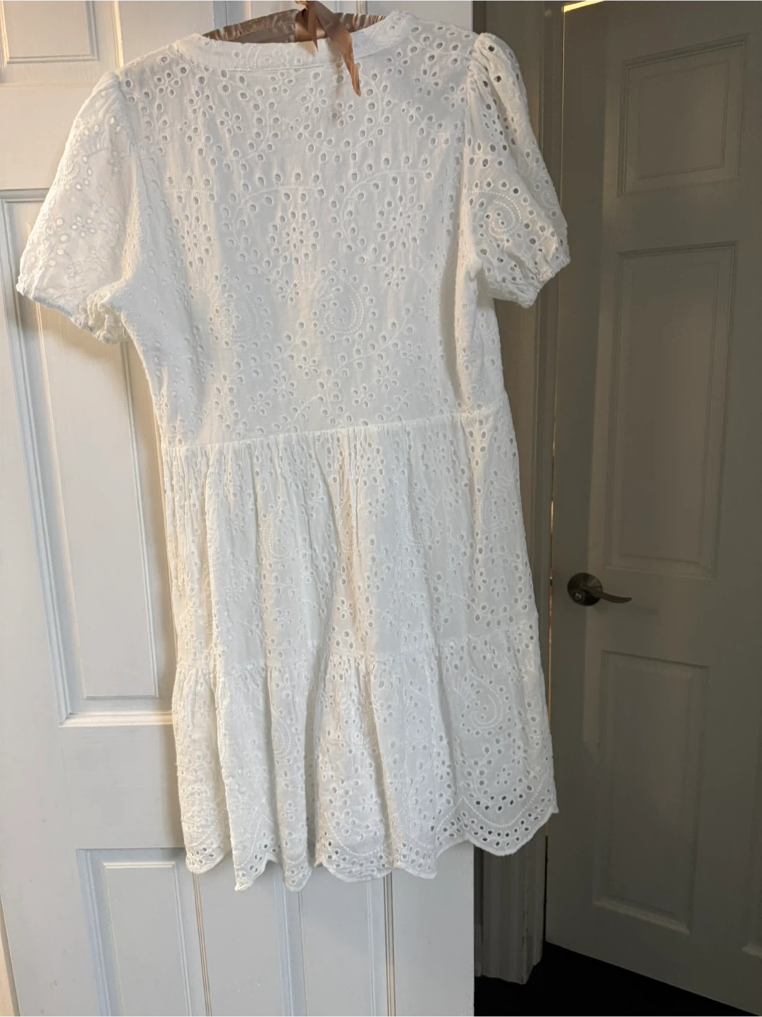 This is a beautiful 100% cotton white eyelet dress from Pink Martini. It's perfect for summer days or evenings out. The dress features a flattering V-neckline and short sleeves, with a tiered skirt. Side zipper. Fully lined. 35 ” from shoulder to hem. It's in great condition as it was only worn a few times. Smoke free, pet free home.