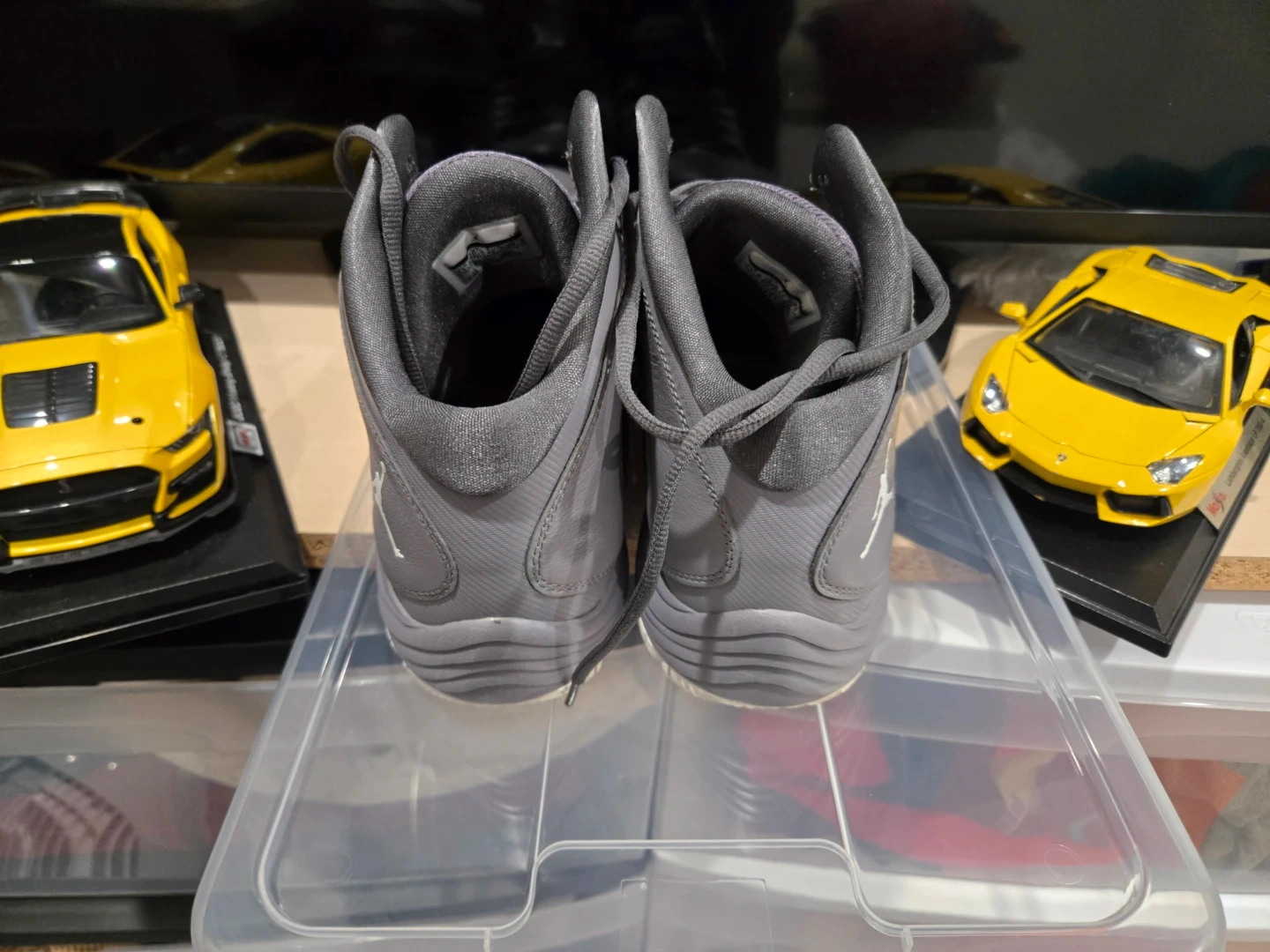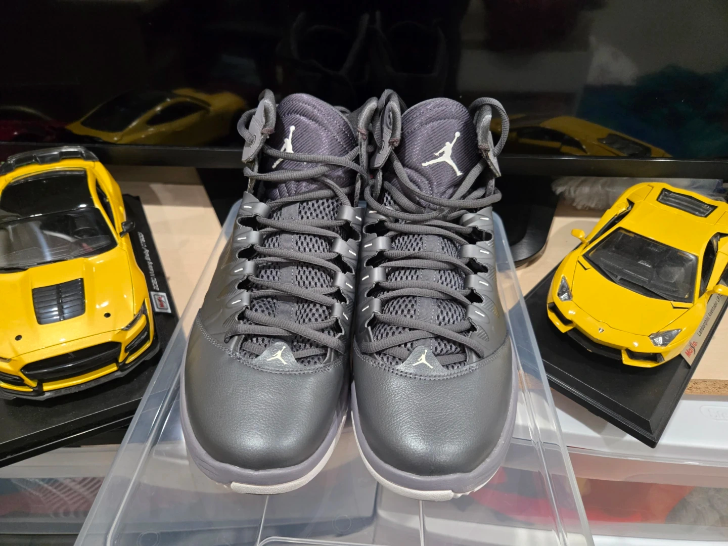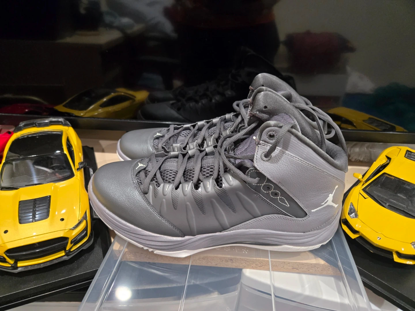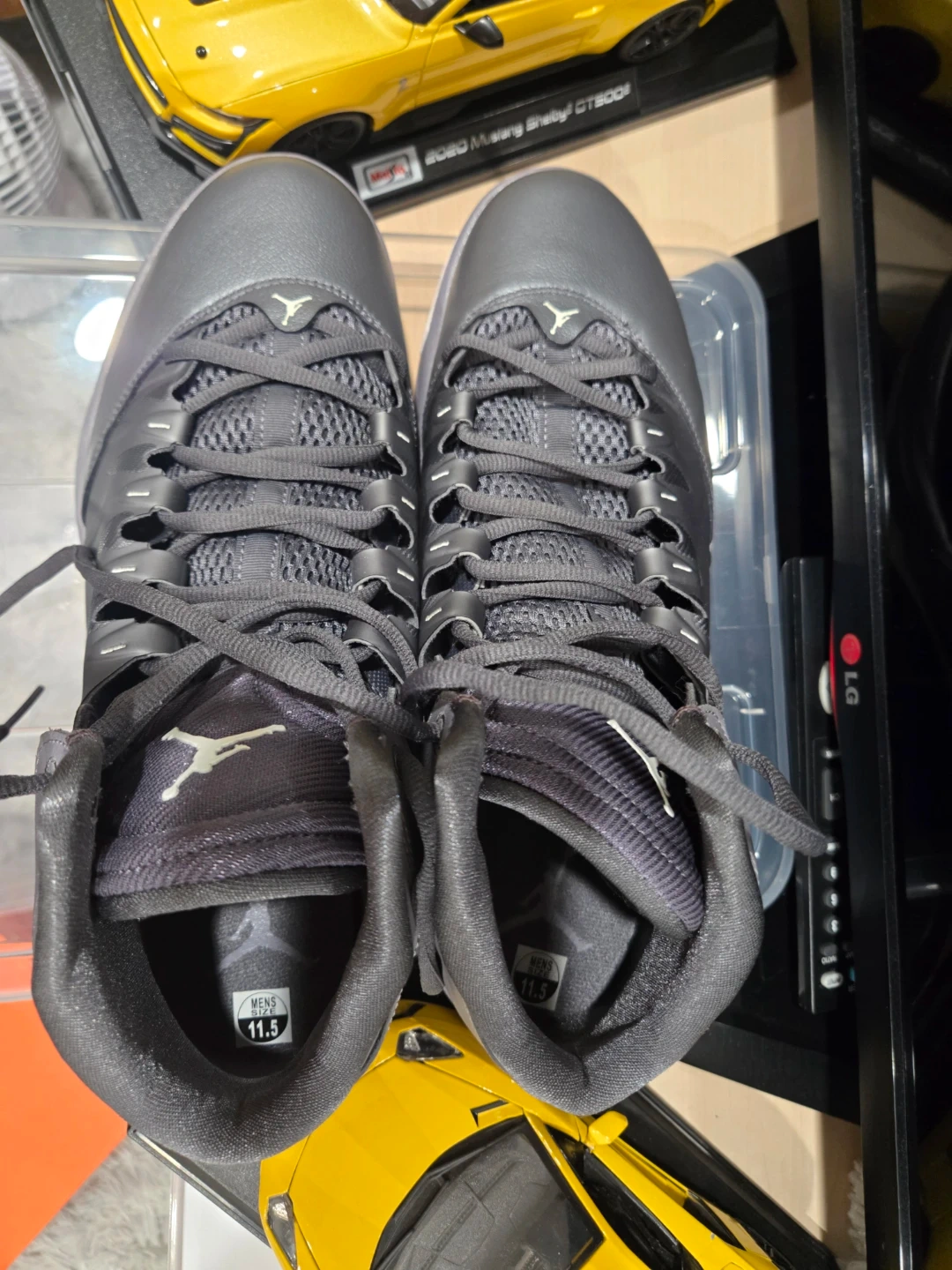 These are a pair of Nike Air Jordan men's basketball shoes in a size 11.5. They're a dark grey colour. This pair is ready for your next game!