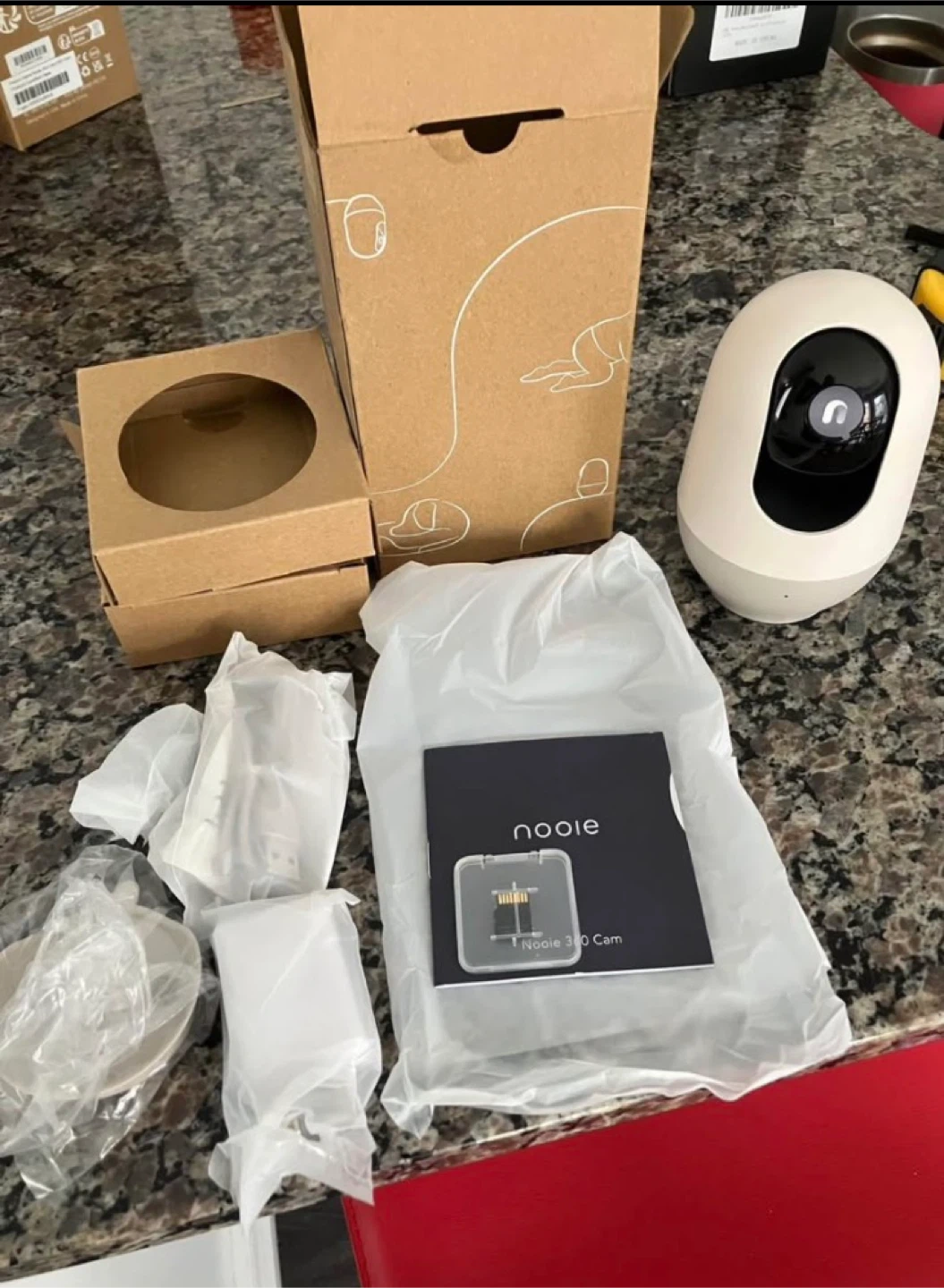 This is a Nooie 360 Cam baby monitor. It comes with its original box, charging cable, and manual. The camera is a sleek, modern design.