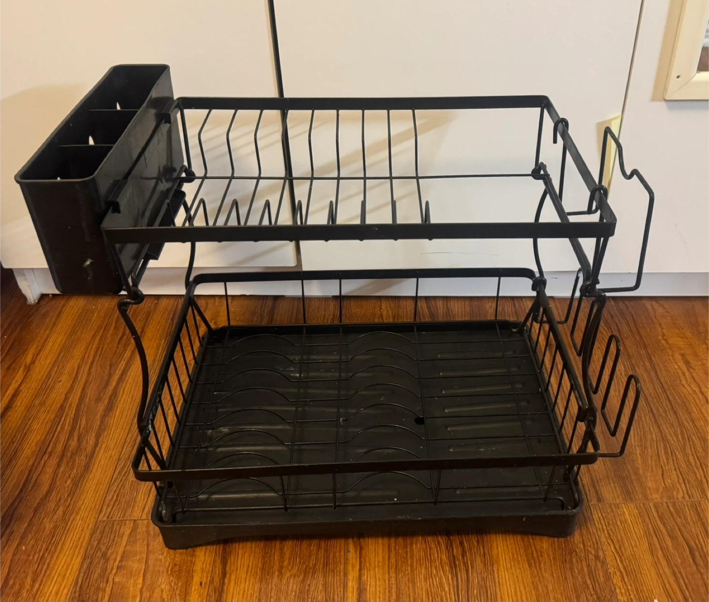 This two-tier dish rack is made of black metal and includes a removable utensil holder. It has a separate tray to catch water. It's perfect for drying dishes and cutlery.