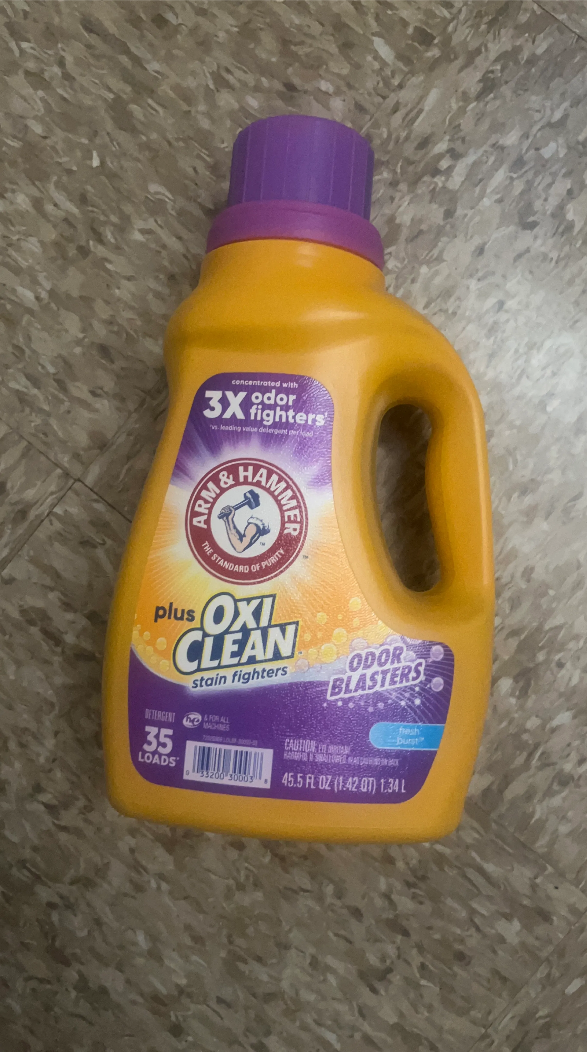 This Arm & Hammer laundry detergent is concentrated with 3X odor fighters and OxiClean stain fighters. It's HE compatible and good for 35 loads. The bottle is 45.5 fl oz.