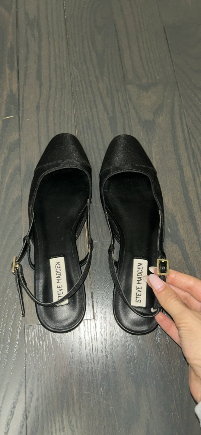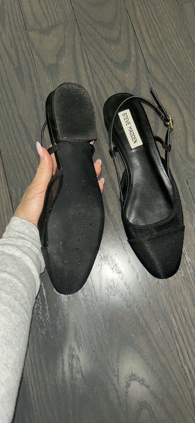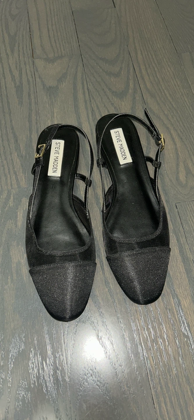 Black slingback flats from Steve Madden. These shoes feature a satin finish on the toe box and a mesh detail on the sides. Buckle closure for adjustability. Comfortable for everyday wear! Size 7 Women’s