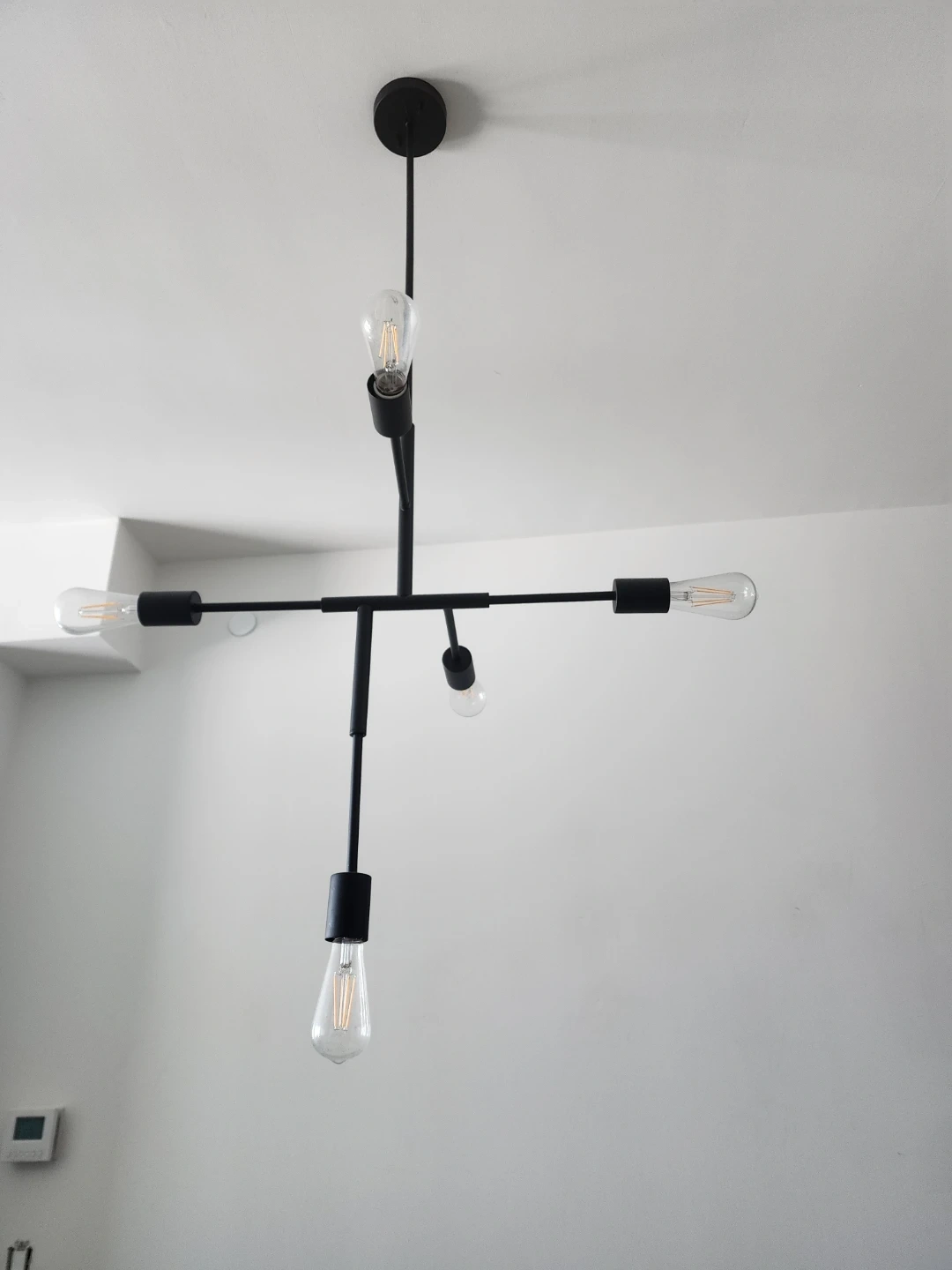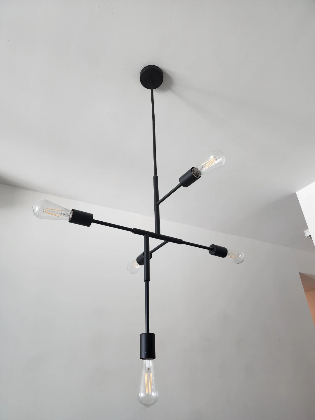 A contemporary black chandelier with a sputnik design. It features five exposed bulbs and a sleek, minimalist aesthetic. This fixture would be a stylish addition to any living room or dining area.