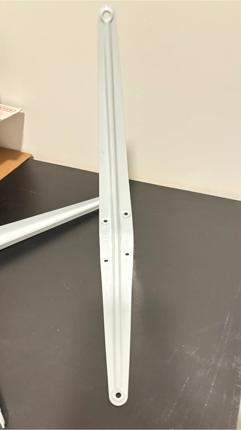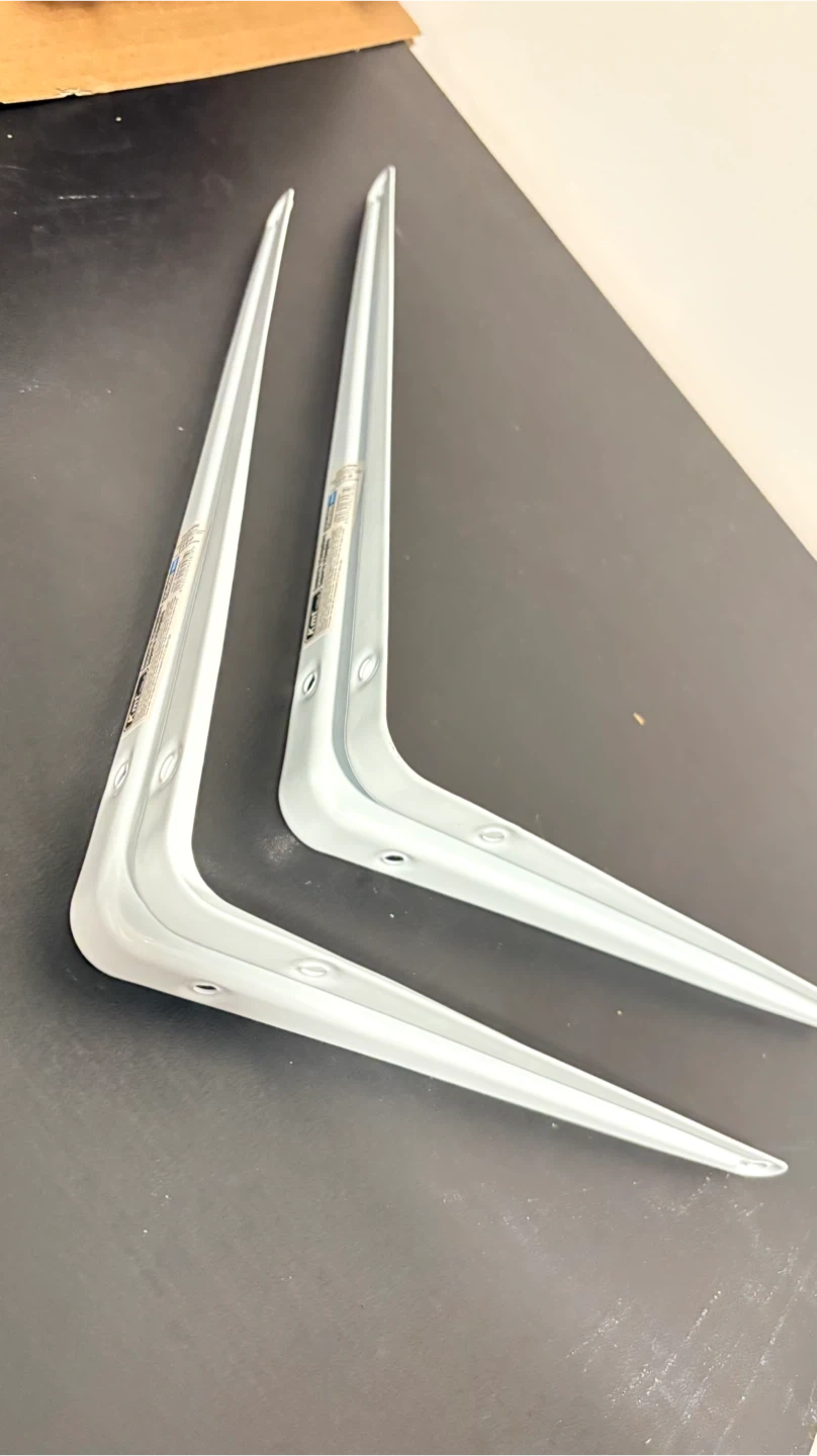 Selling a set of two white shelf brackets. These are sturdy and made of metal. They're suitable for holding shelves for storage or display.