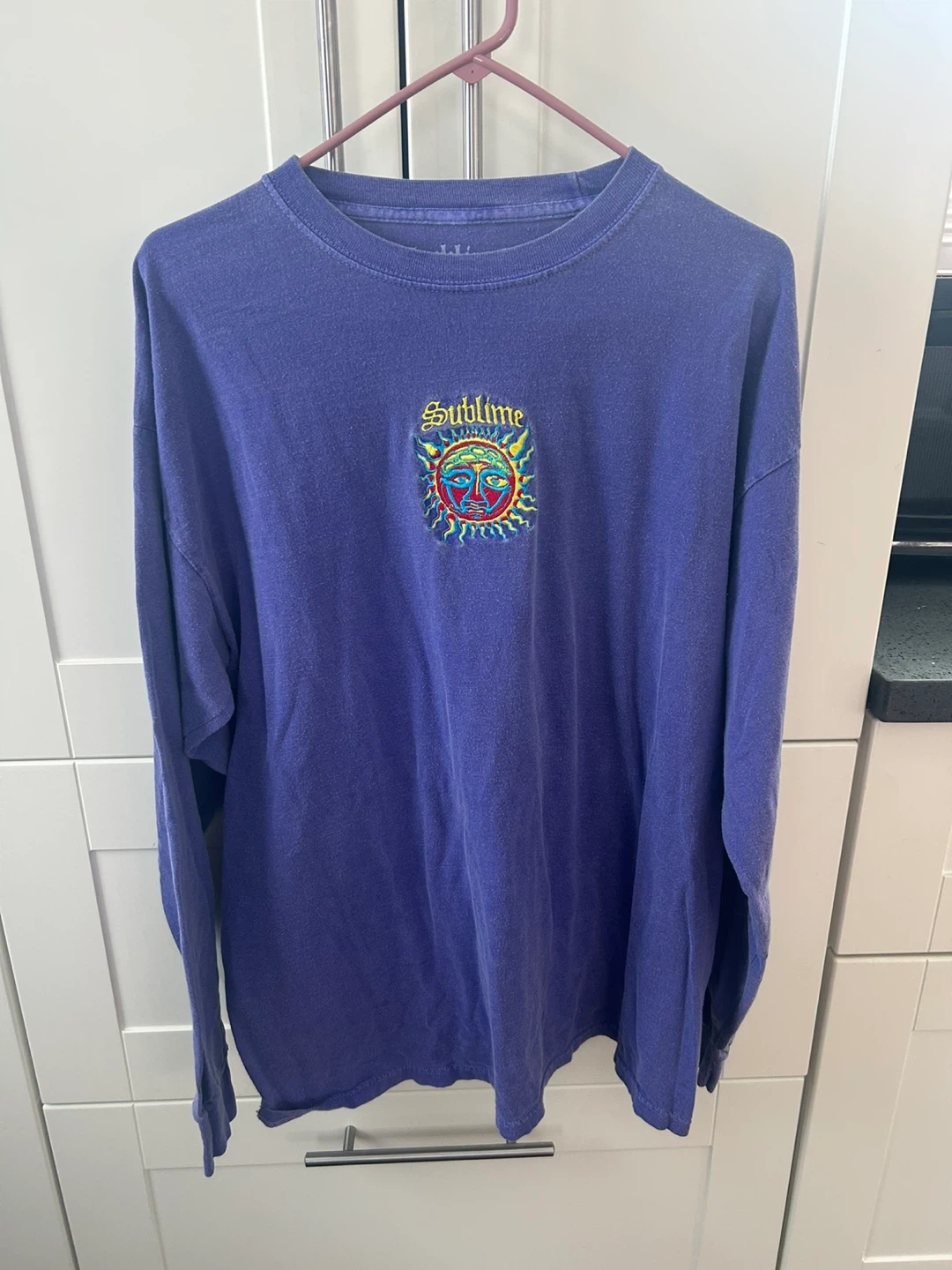 Purple long sleeve t-shirt with the iconic Sublime sun logo embroidered on the front. Made from 100% cotton. Machine wash cold with like colours. Tumble dry low. Do not iron decoration.