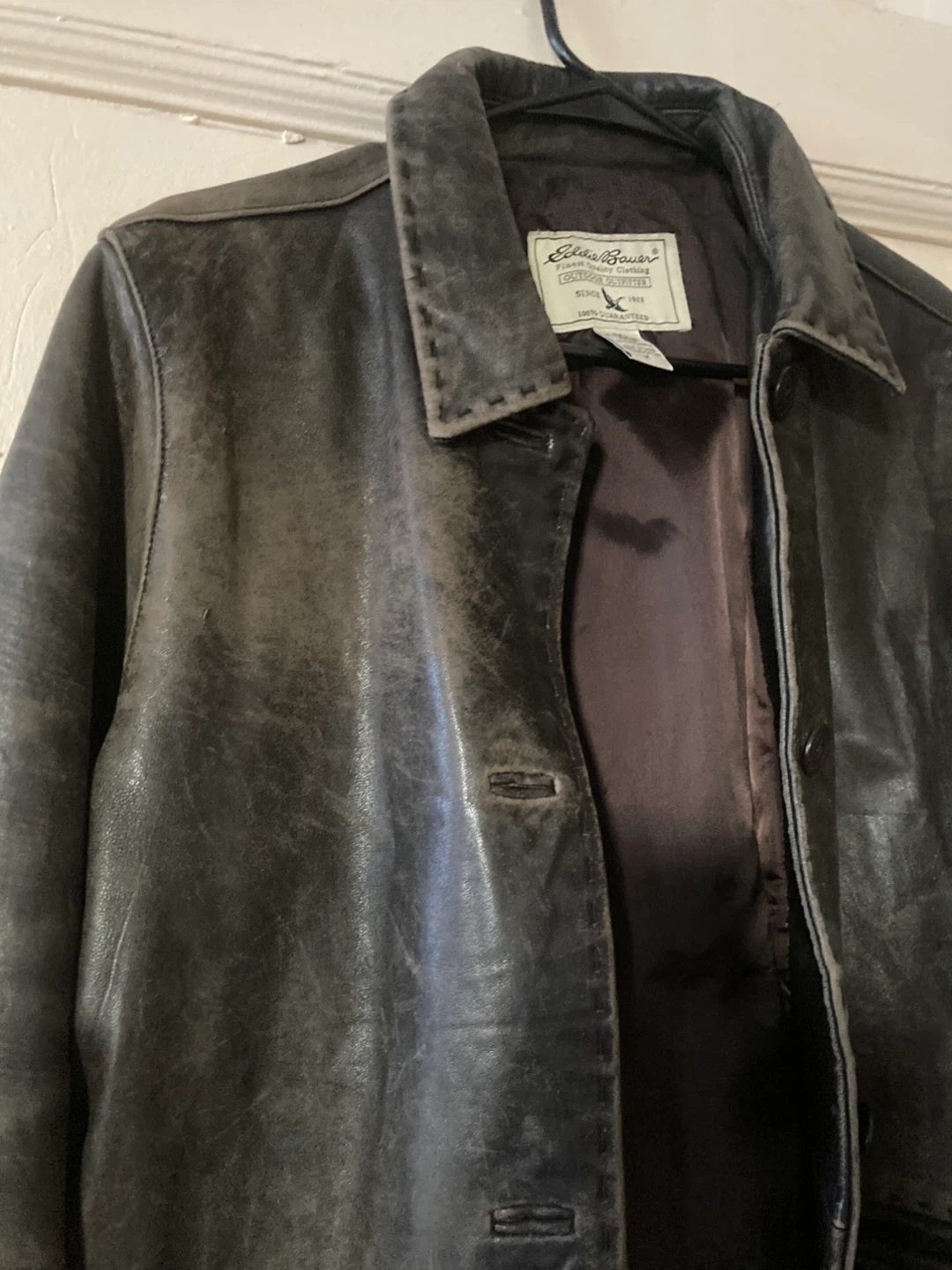 Selling a stylish Eddie Bauer lambskin leather jacket in size medium. It has a classic outdoor outfitter design and is made with 100% guaranteed quality. Perfect for adding a touch of ruggedness to your wardrobe!