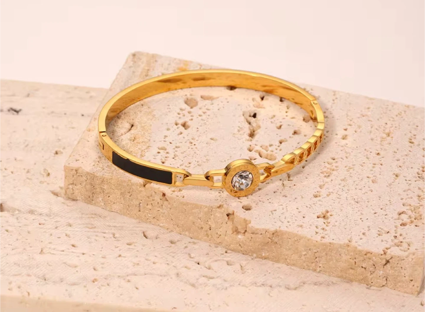 Selling a beautiful gold-tone bangle bracelet in the style of Bvlgari! It features a unique design with a central round accent and chain detailing. The bracelet is in great condition and has a sleek, modern look. The central accent is 10mm in diameter and the bracelet weighs 12.1g