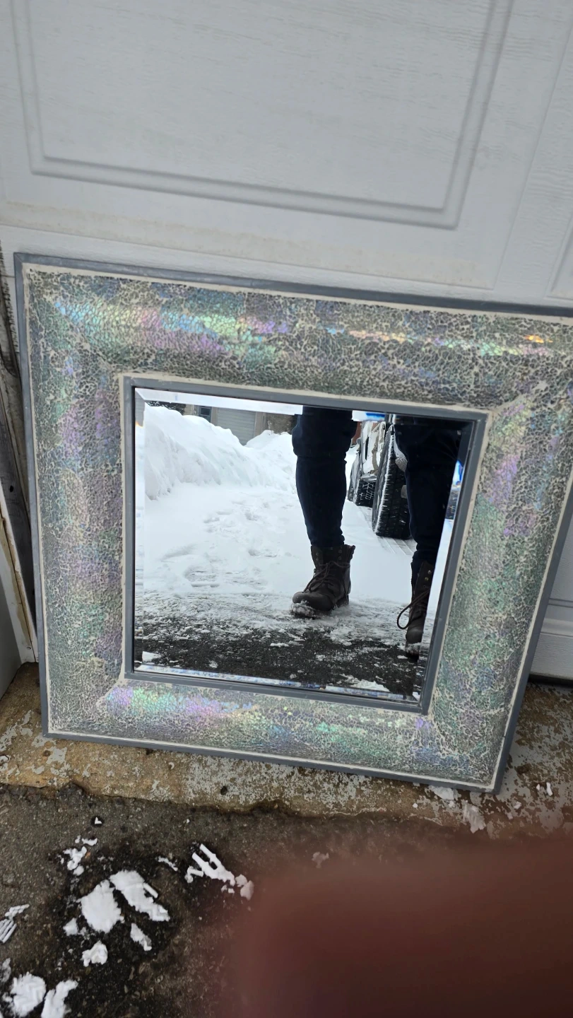 Unique square wall mirror with a textured, iridescent frame. It's a lovely piece for adding a touch of sparkle to any room. The frame has a mosaic-like finish.