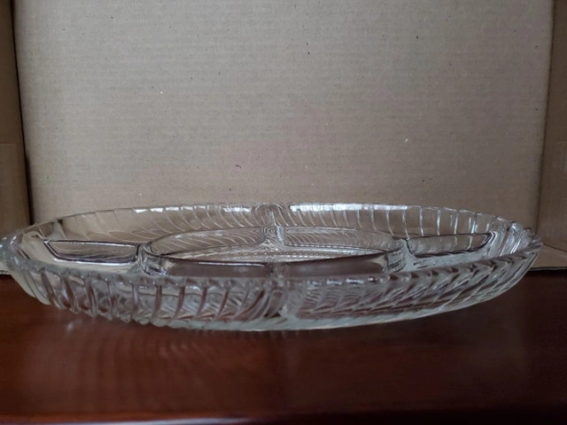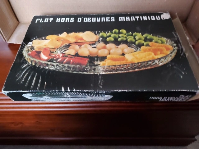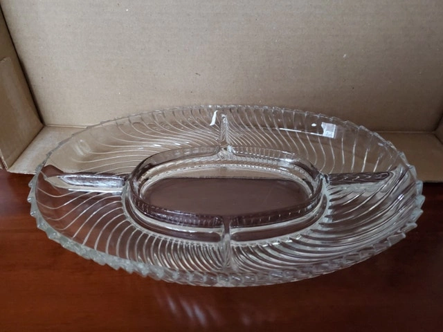 A vintage hors d'oeuvres dish by Veropa (Verreries du Gier). Made in France, the model is "Martinque". It's heavy glass, 5-sections, oval-shaped and measures about 12.25" x 8.25". It's in the original box. $10.00, pick up only