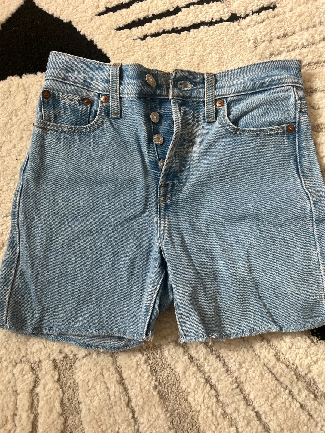 These are classic Levi's denim shorts in a light wash. They feature a button-fly closure and a raw hem. Made from durable denim.