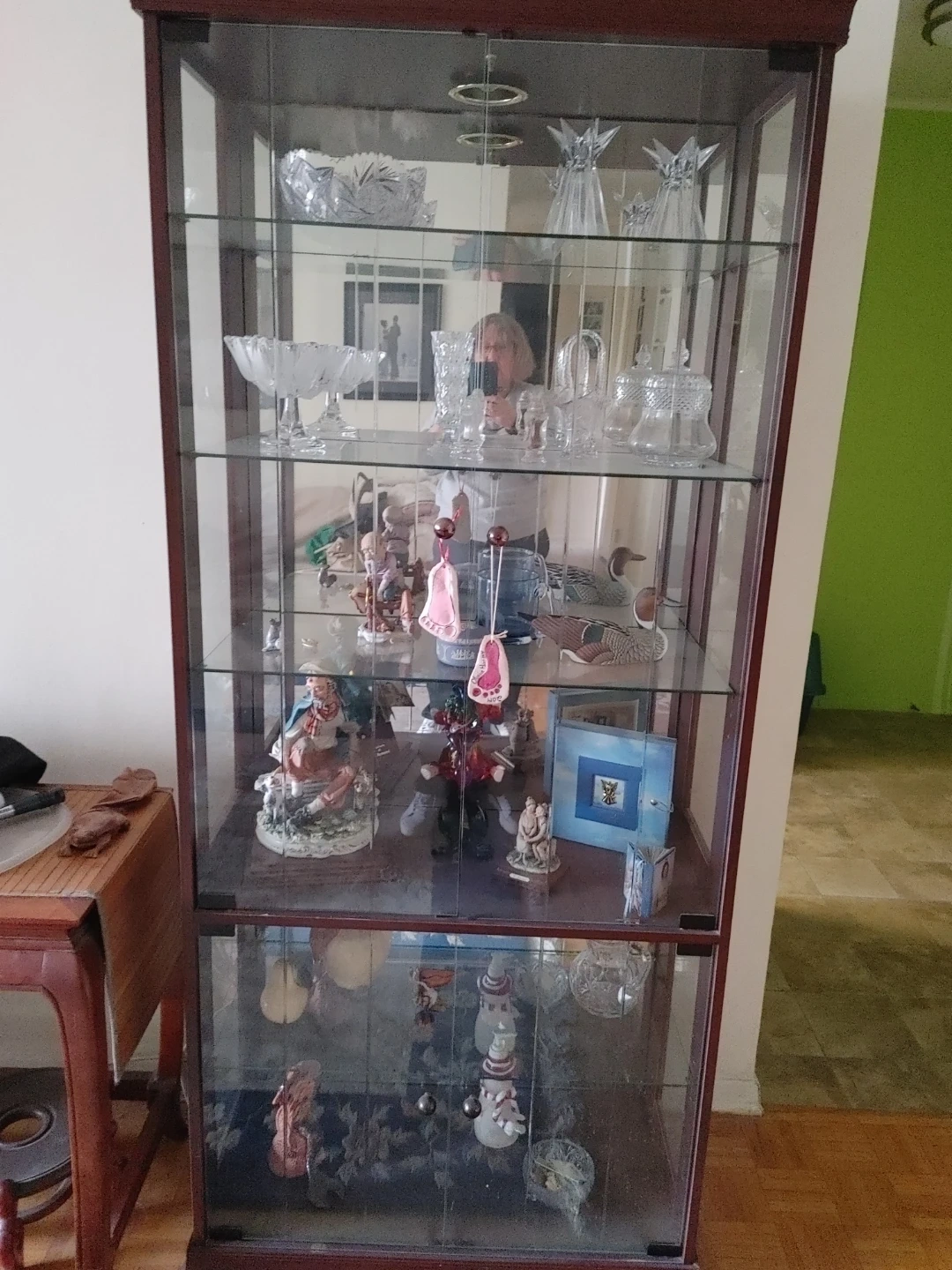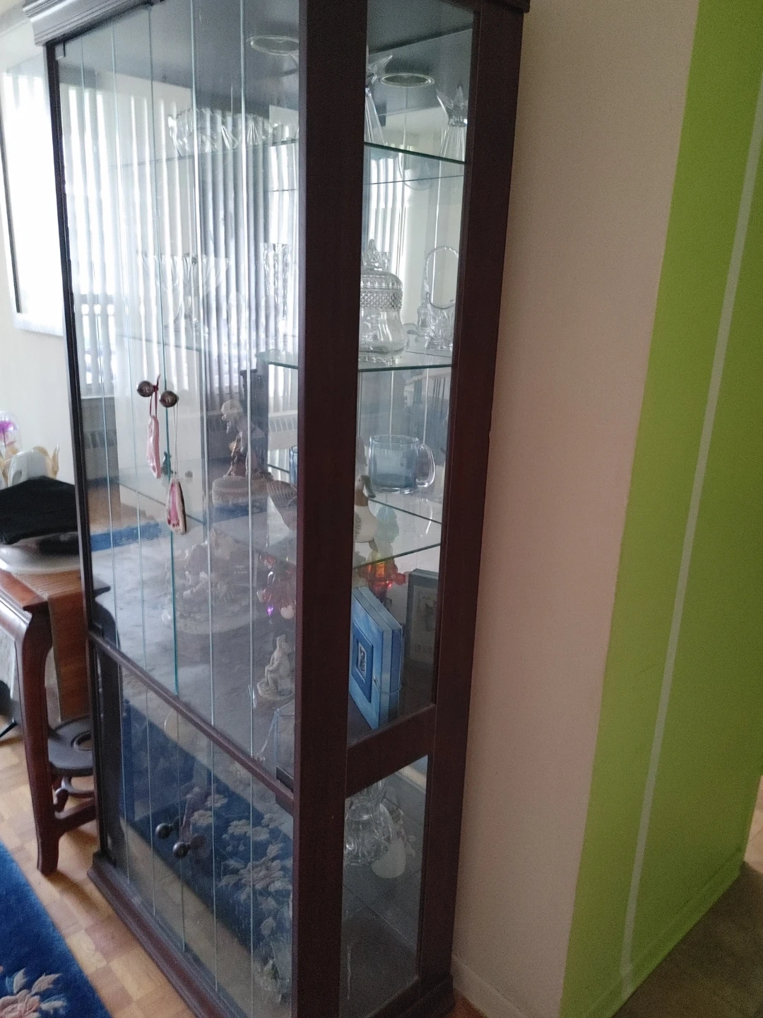 Tall glass display cabinet with a dark wood frame. It has multiple shelves for showcasing items and a lower cabinet section. Perfect for collectibles or decorative pieces!