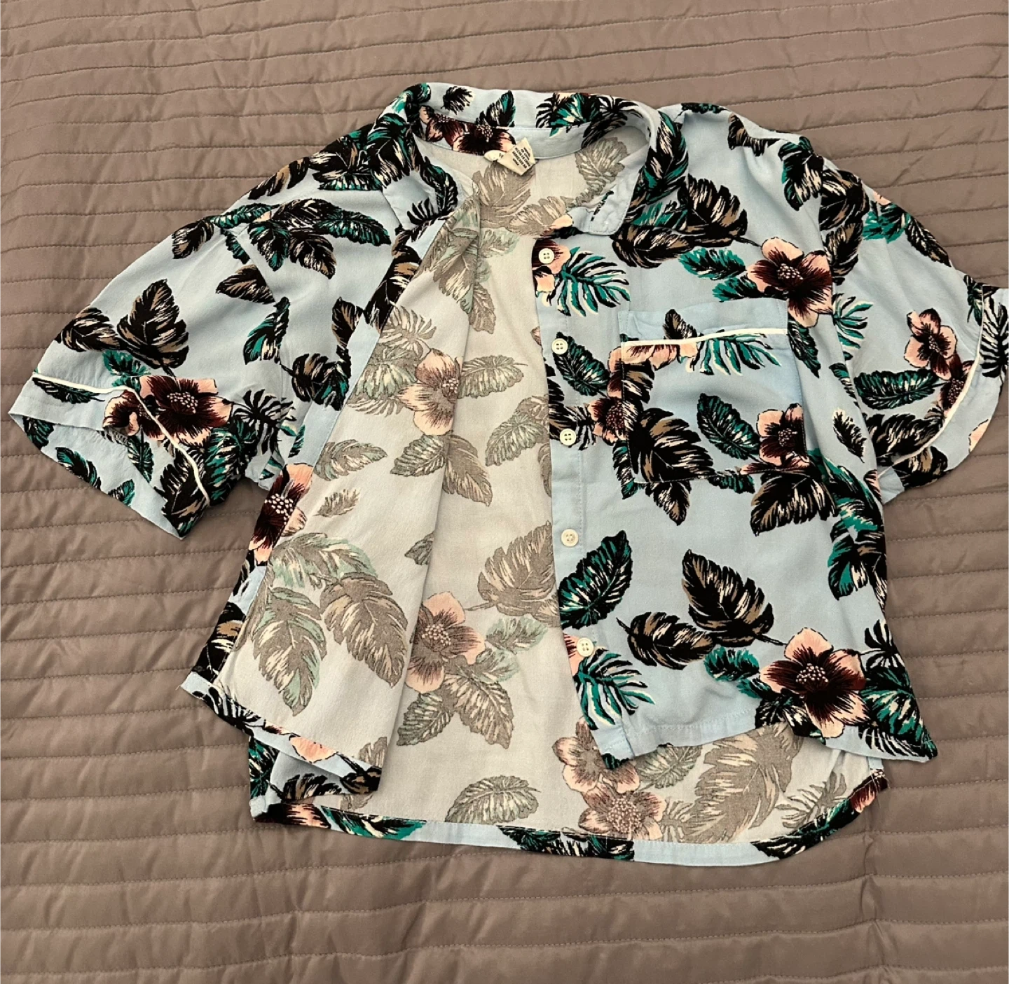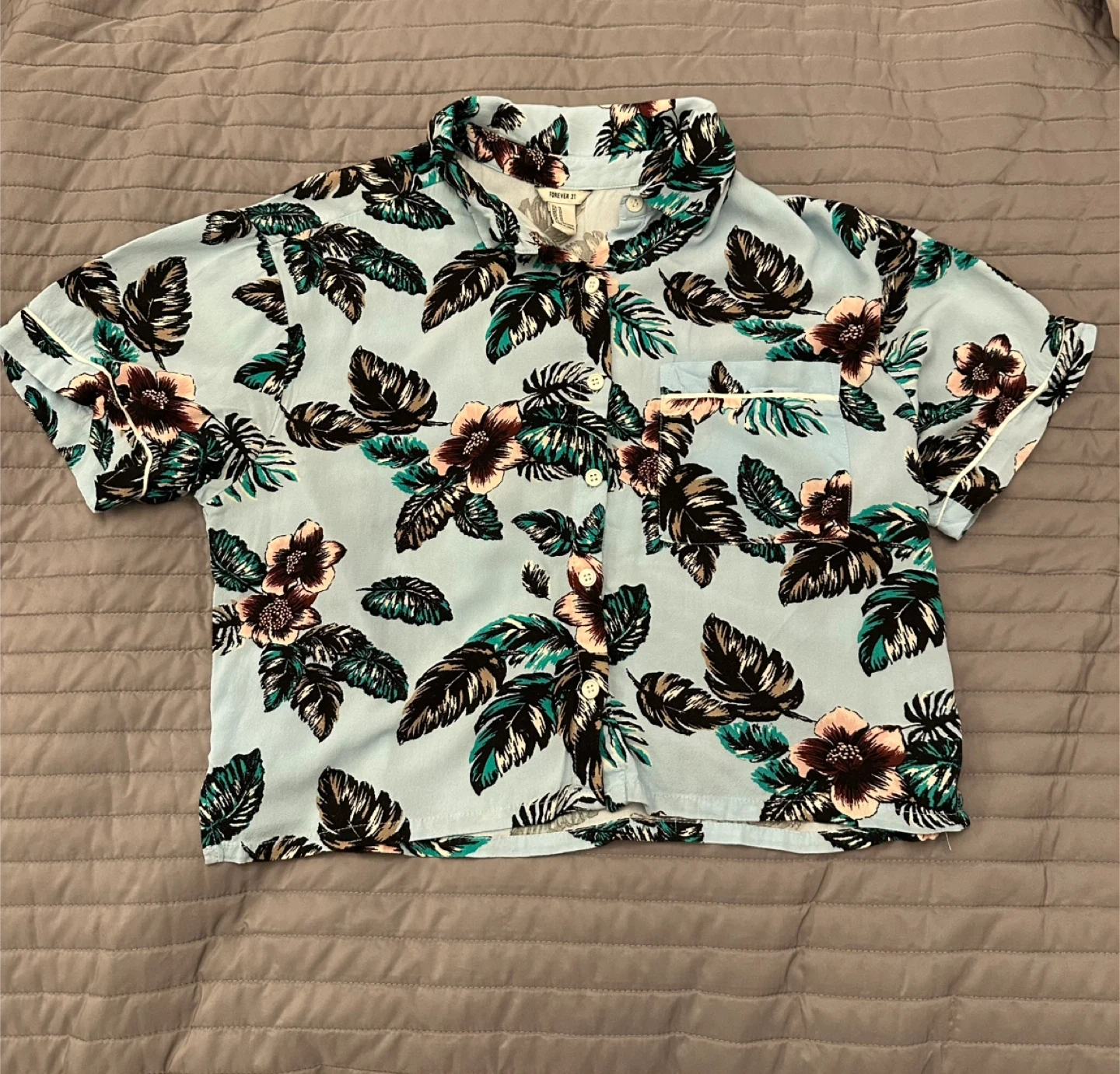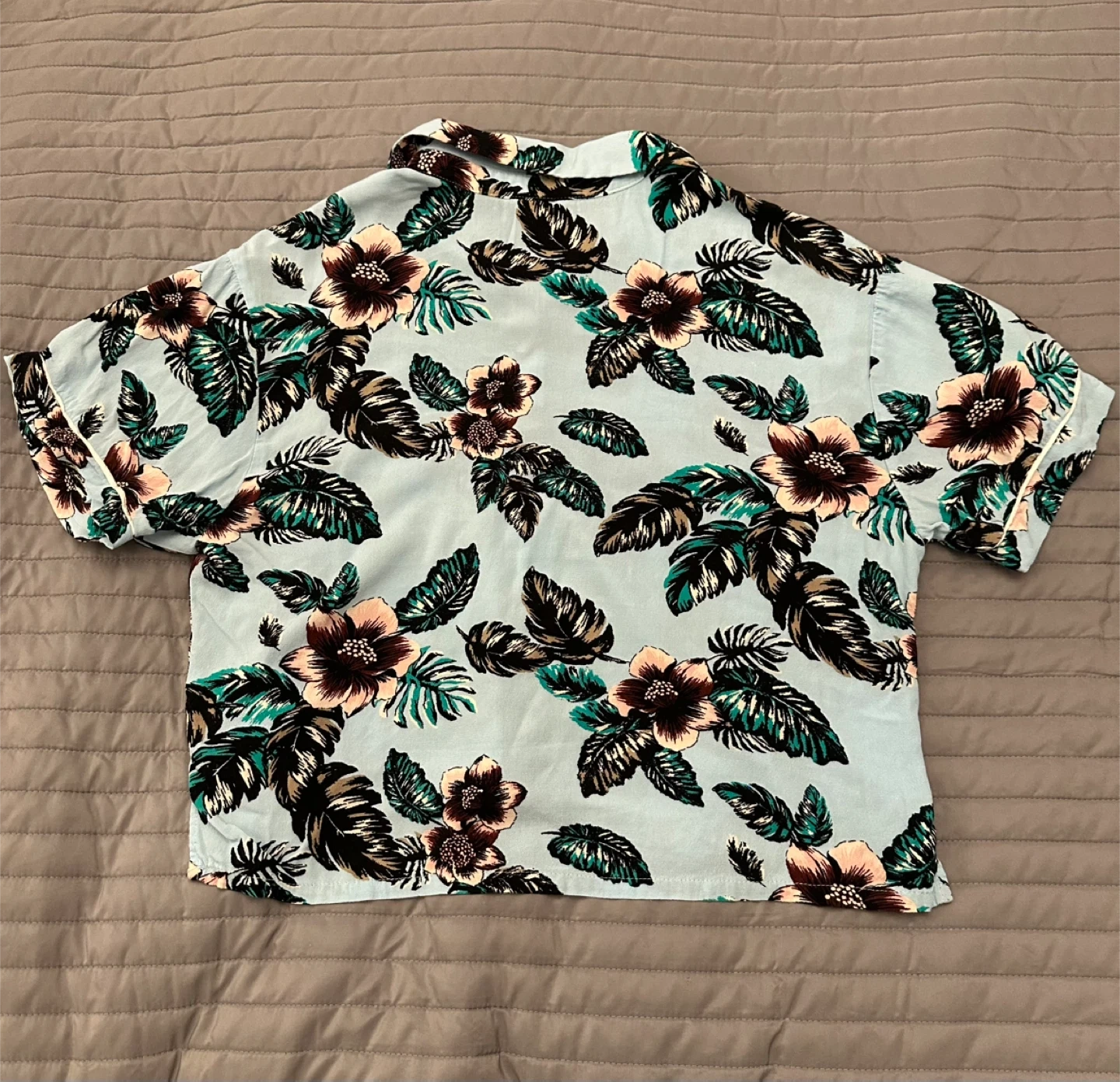 Light blue short sleeve button up shirt with a tropical floral print. It is cropped and has a collar and a chest pocket. Made for a relaxed fit.
