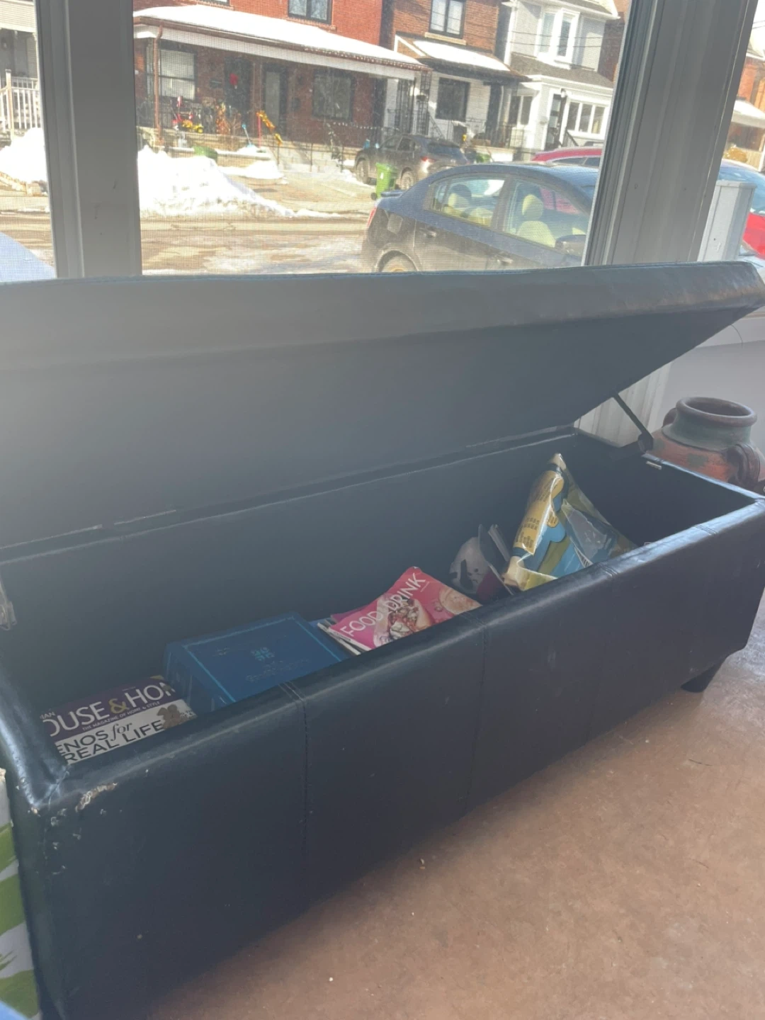 This faux leather storage ottoman bench is a versatile piece for your home. It opens up to reveal ample storage space inside. Perfect for stowing blankets, magazines, or other household items! Does have some wear but great for storage!