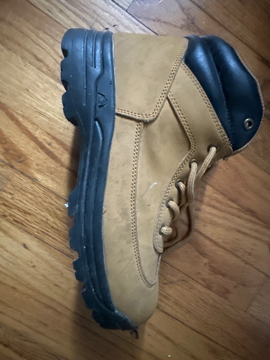 These men's work boots are constructed from durable tan leather with a black rubber sole. They feature a classic lace-up design and a padded collar for comfort. Suitable for various work environments.