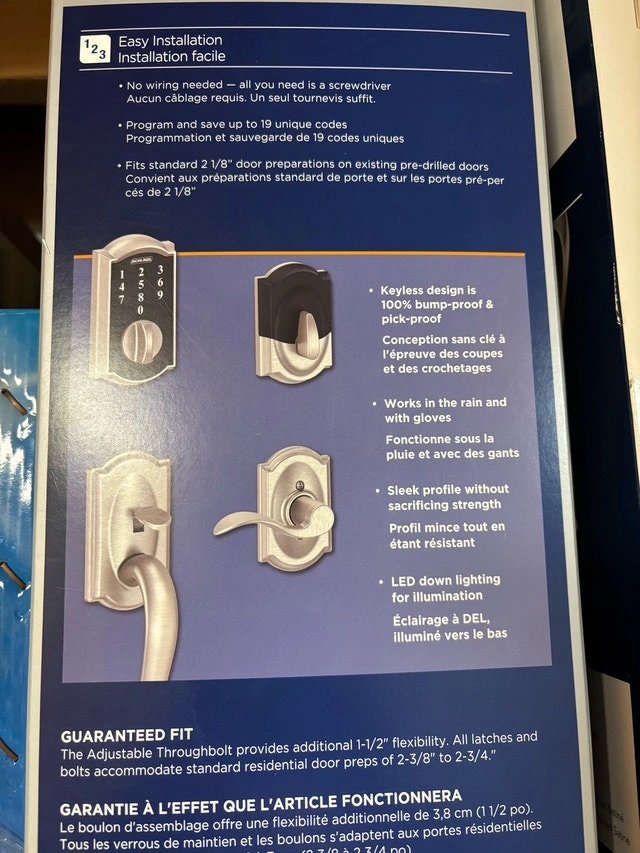 Upgrade your home's security with this Schlage Touch Keyless Touchscreen Handleset. It boasts Grade 2 residential security, touchscreen entry, and easy installation. Features include: No wiring needed, program and save up to 19 unique codes, fits standard 2 1/8" door preparations on existing pre-drilled doors, keyless design is 100% bump-proof & pick-proof, works in the rain and with gloves, sleek profile without sacrificing strength, LED down lighting for illumination. Based on Kijiji listings, a similar, well-maintained unit is reasonably priced at $175. If you're reading this, it's still up for grabs, so don't miss out! Condition: Used - Like new. Payment: Cashless payment, Cash accepted.