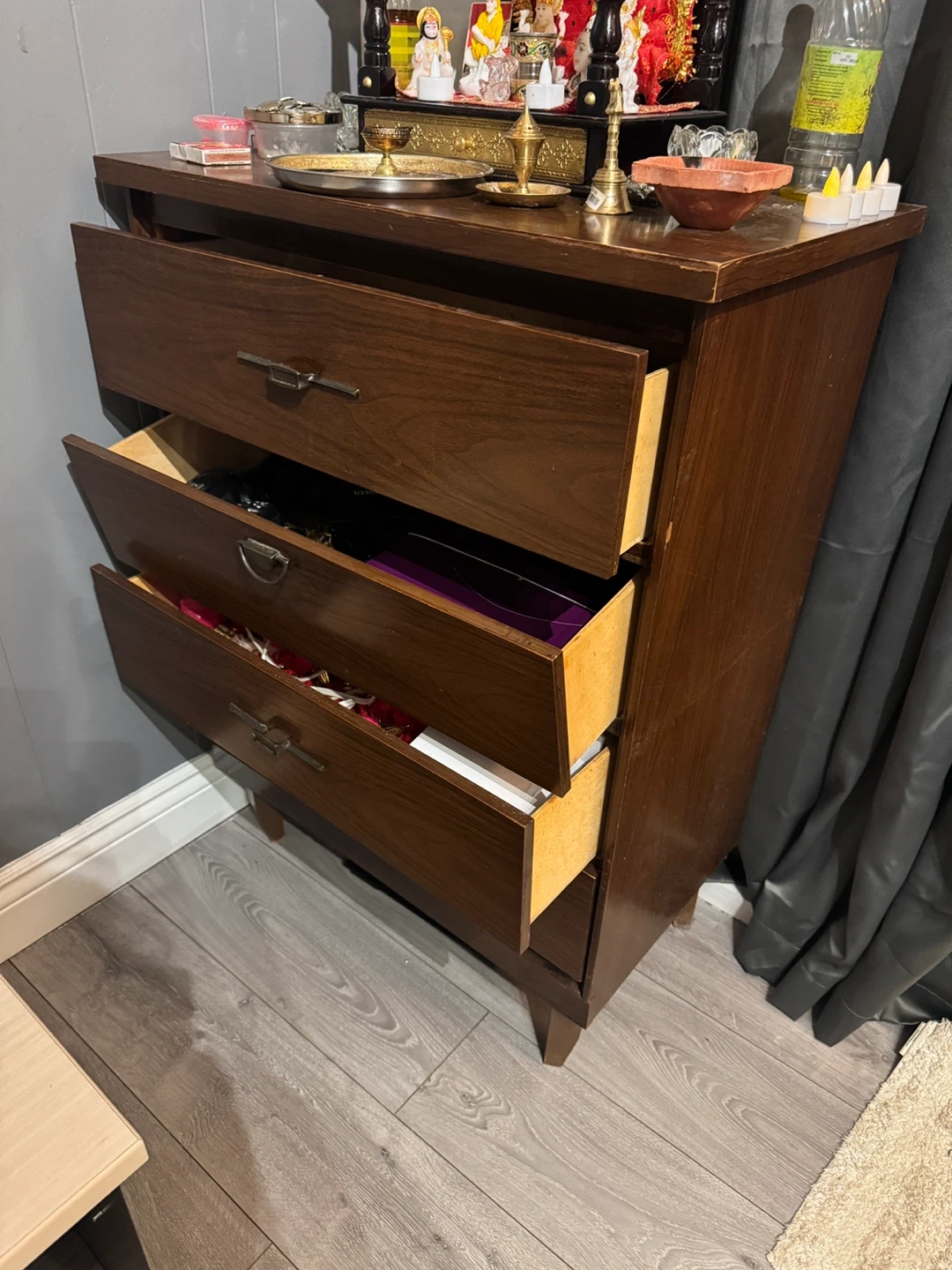 This vintage chest of drawers is made from dark wood. It features four drawers with metal handles. Provides ample storage space for your belongings.