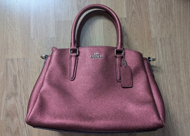 This is a Coach purse in a beautiful, shimmering red-bronze colour with a metallic finish and signature Coach details. This purse has been gently enjoyed and is in good condition, ready to add a touch of sparkle to your wardrobe! Bought for over $400!! Colour: Rose-bronze metallic. Brand: Coach. Material: High-quality leather with metallic finish. Features: Interior pockets, detachable tag.