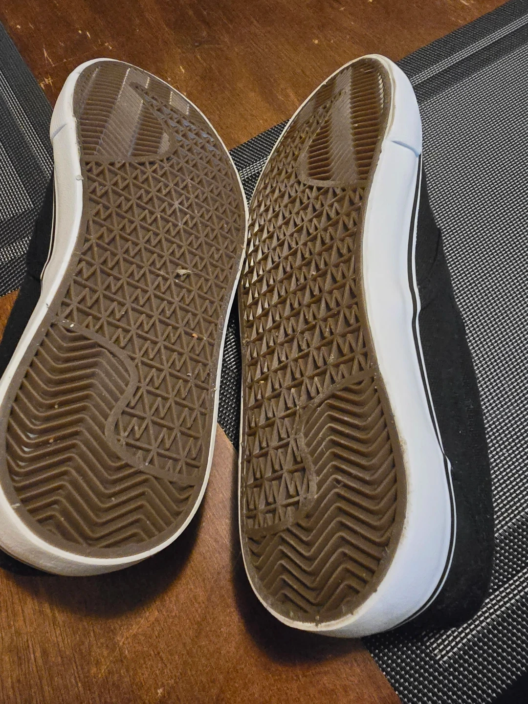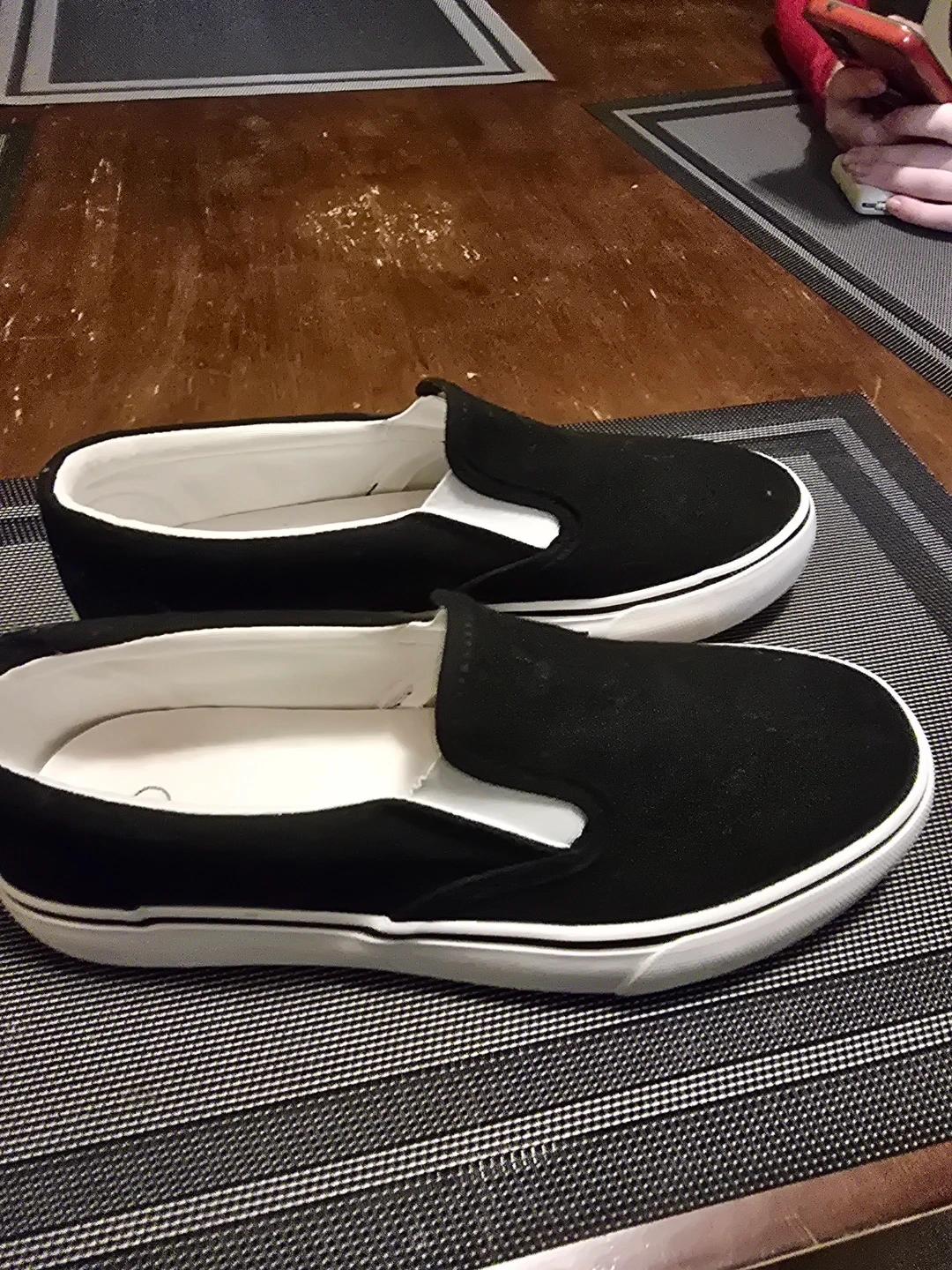 Classic black slip-on sneakers with white soles. Featuring a durable rubber outsole and a comfortable interior. Size 8 women's.