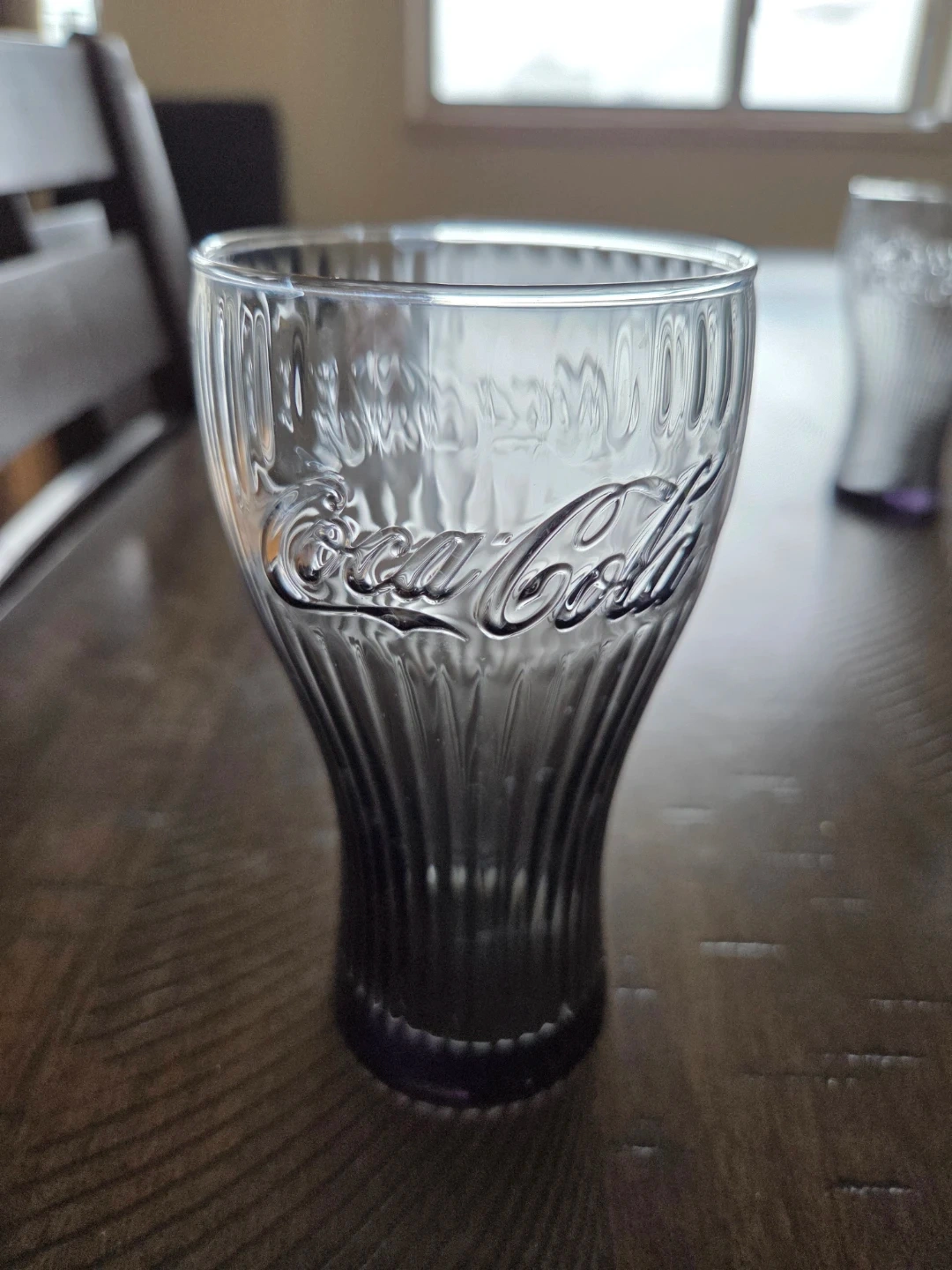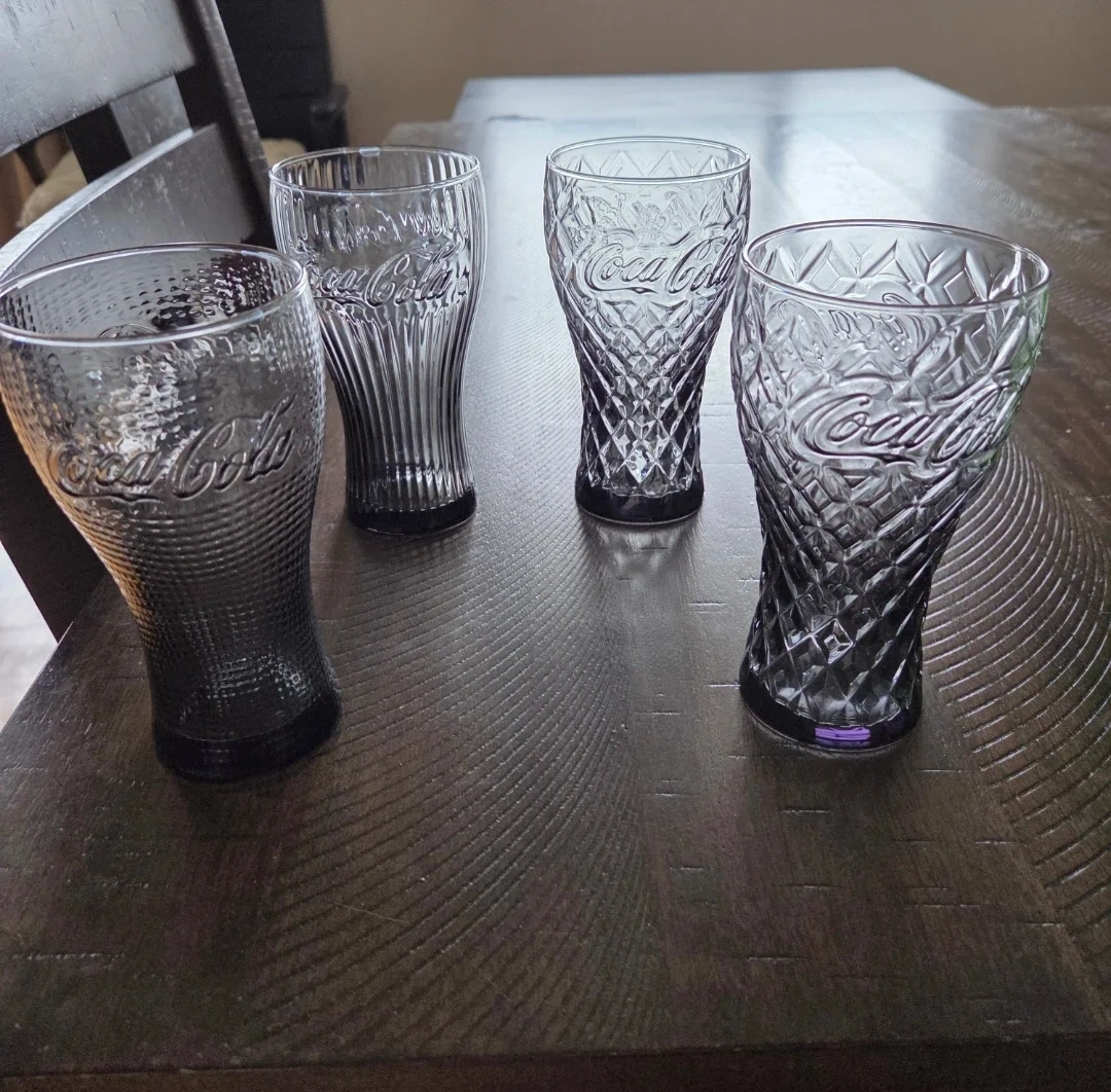Set of four Coca-Cola themed glasses. Features three different embossed designs with the iconic Coca-Cola logo. Two of the glasses are the same design and the other two are different. They have a slight navy tint to them. Perfect for enjoying your favourite beverages!