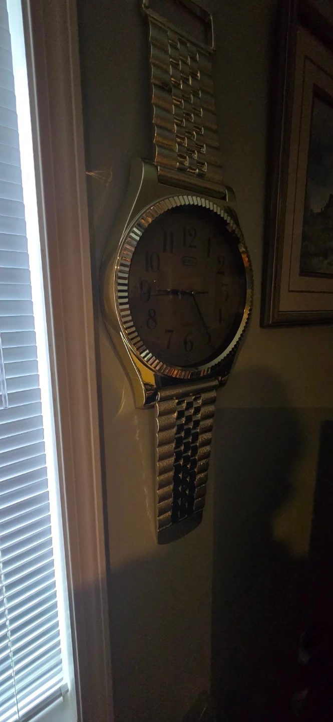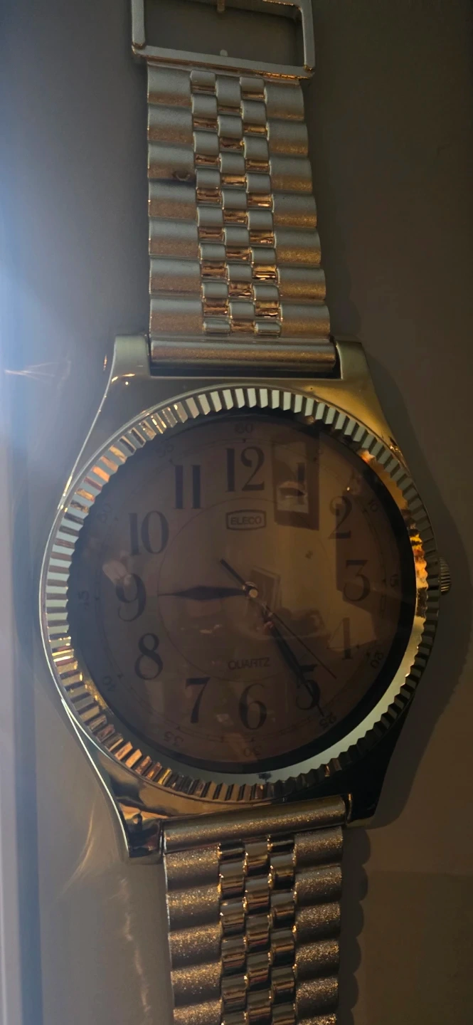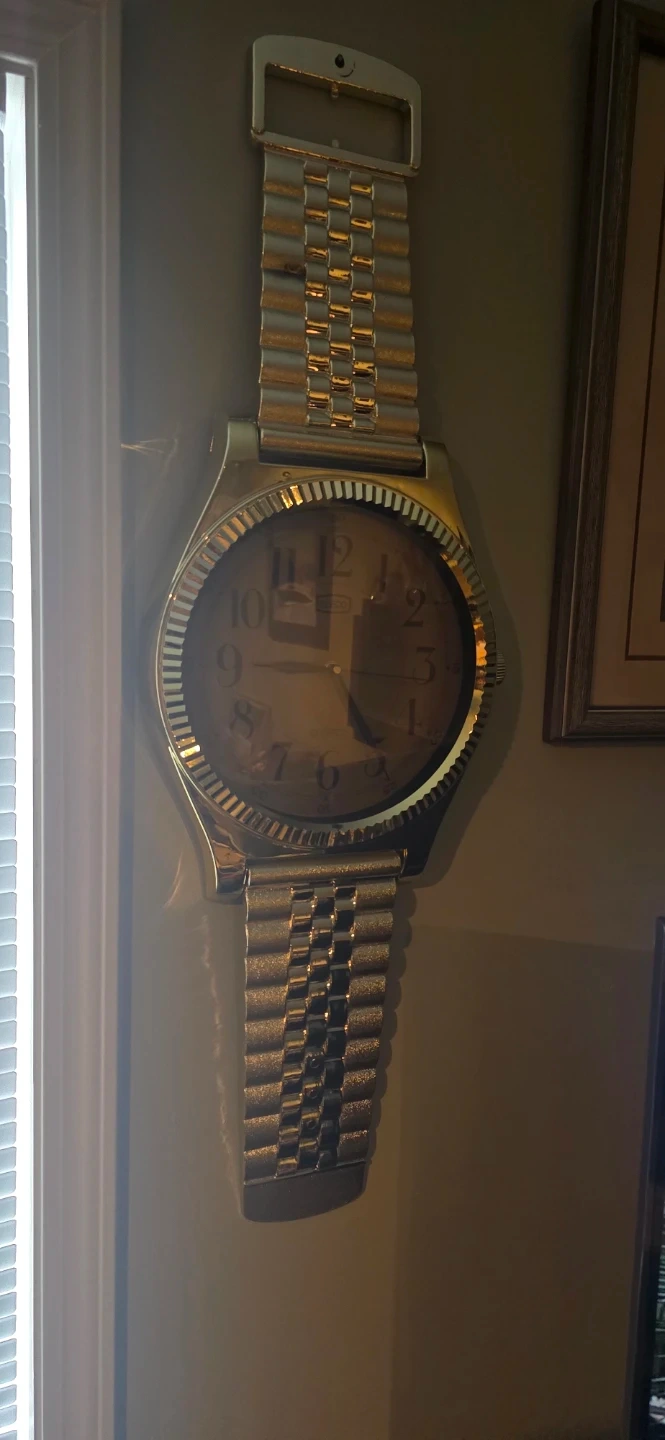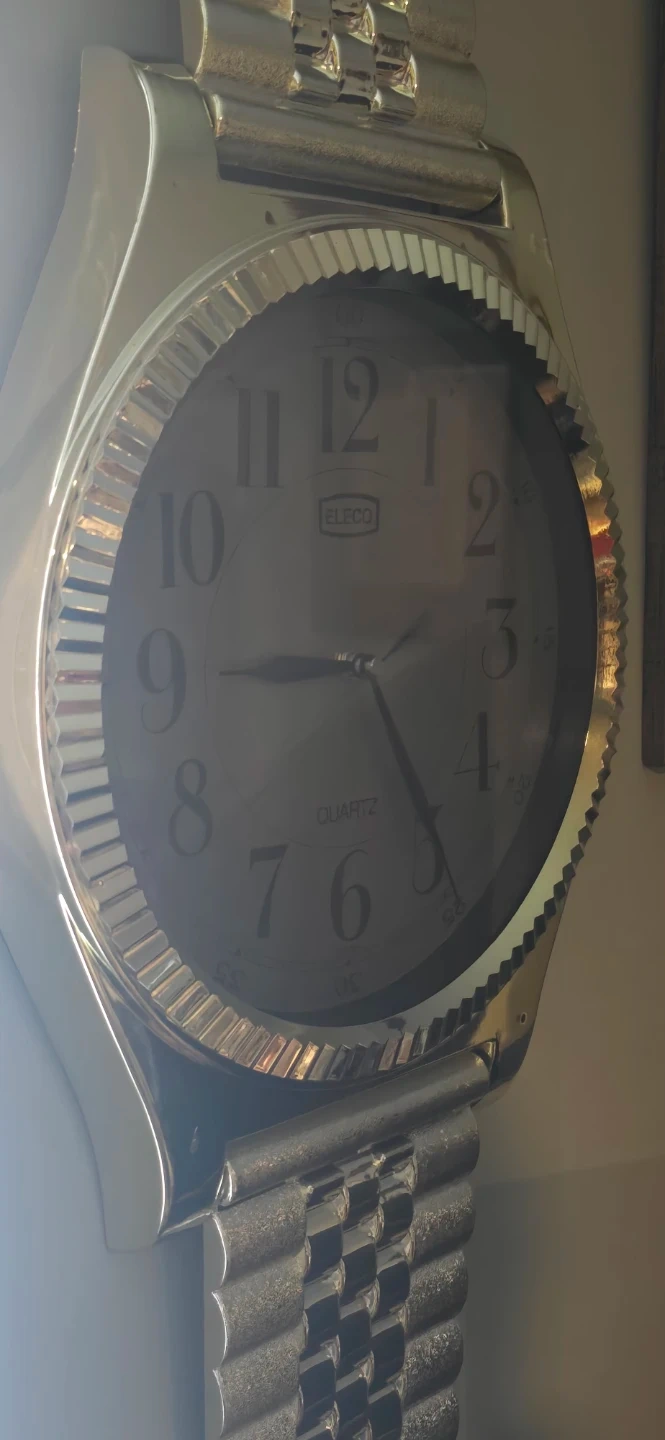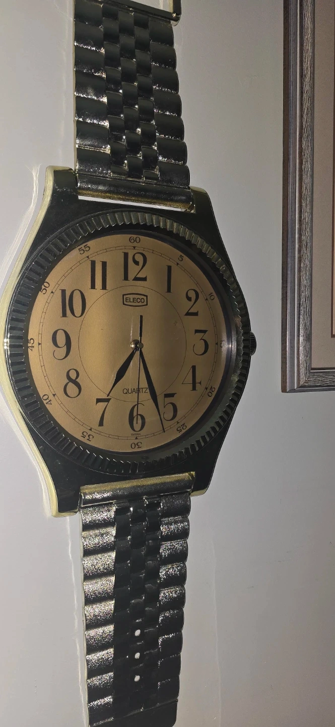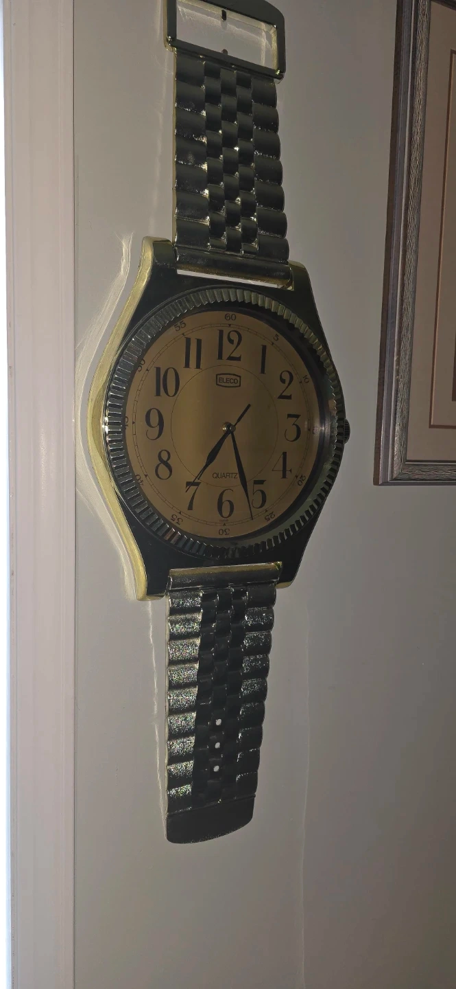 This is a large Elco wall clock with a gold-tone finish, designed to look like a wristwatch. It has a quartz movement for accurate timekeeping. Great for a statement piece in a den or office! Works perfectly