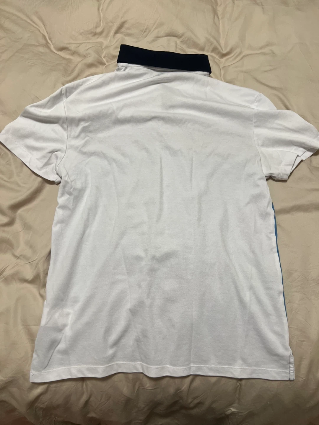 Here's a Calvin Klein polo shirt in size medium new without tags. It features a colour block design with white, blue, and navy. The fabric is quick-drying and wicking, perfect for staying comfortable!