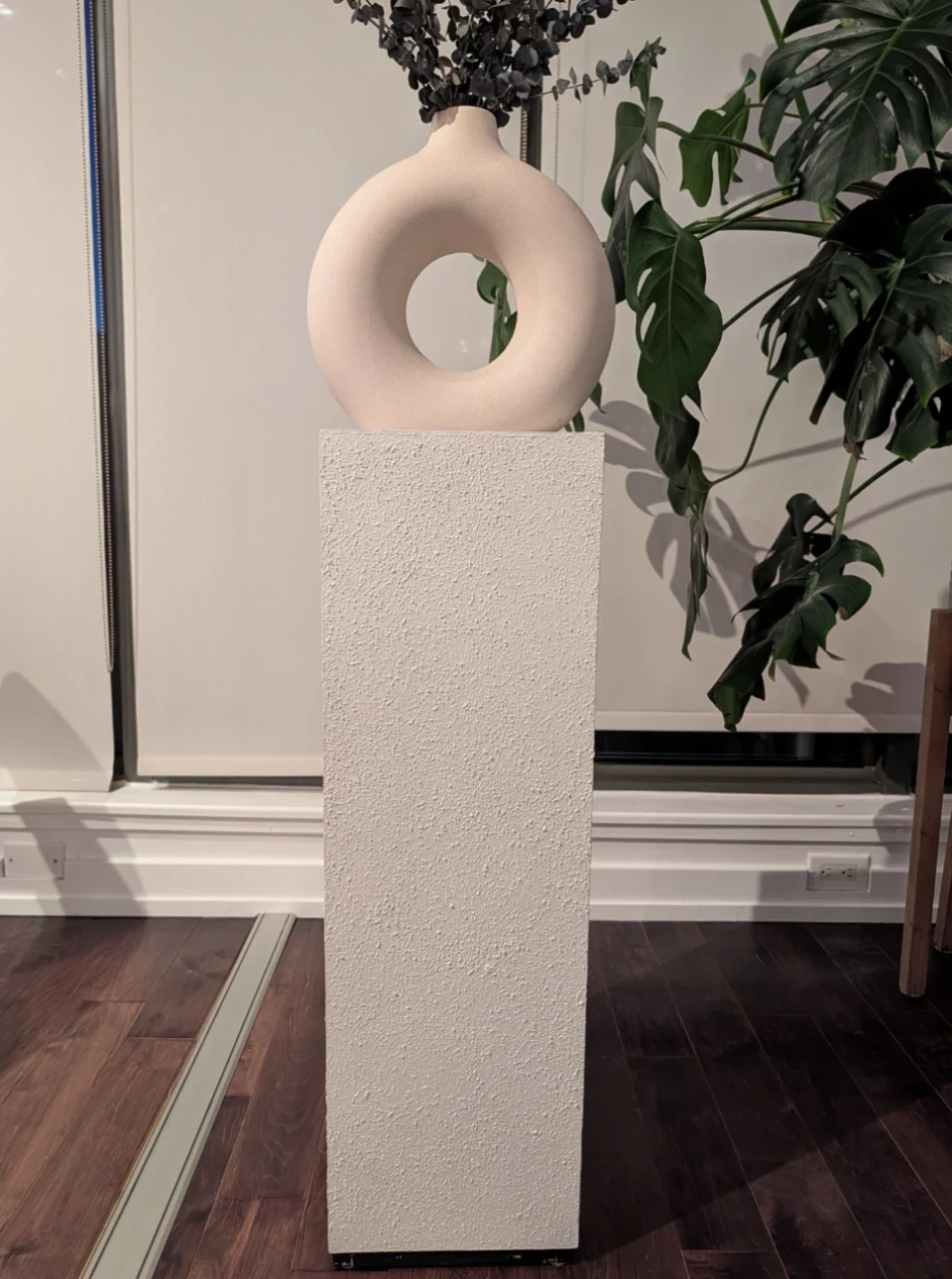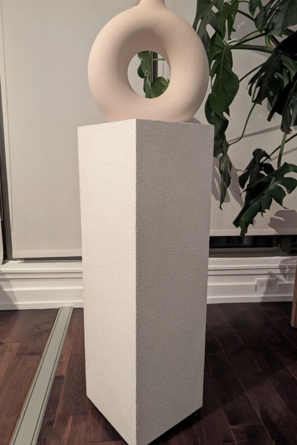 This white textured pedestal stand is perfect for displaying sculptures, plants or other house decor. It's a great statement piece!