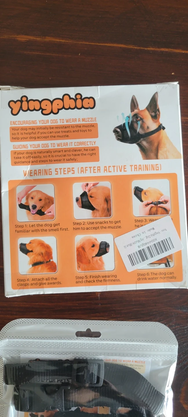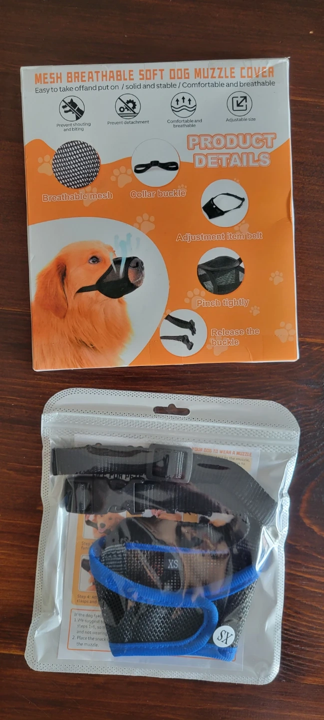 This brand new, sealed soft dog muzzle is made of breathable mesh material. It features an adjustable strap and buckle for a secure fit. It's designed to prevent biting and barking. This muzzle is suitable for small dogs.